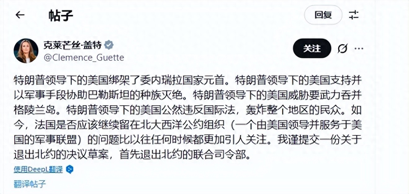 1月9日,法国国民议会副主席克莱门斯·盖特在社交媒体上发文,称鉴于特朗普的一系列“不友好行动”,包括支持以色列对巴勒斯坦的种族灭绝、绑架委内瑞拉总统马杜罗,以及觊觎格陵兰岛,她已提交了一项要求法国退出北约的提案并决定召开议会表决,先从退出北约的一体化军事指挥体系开始。