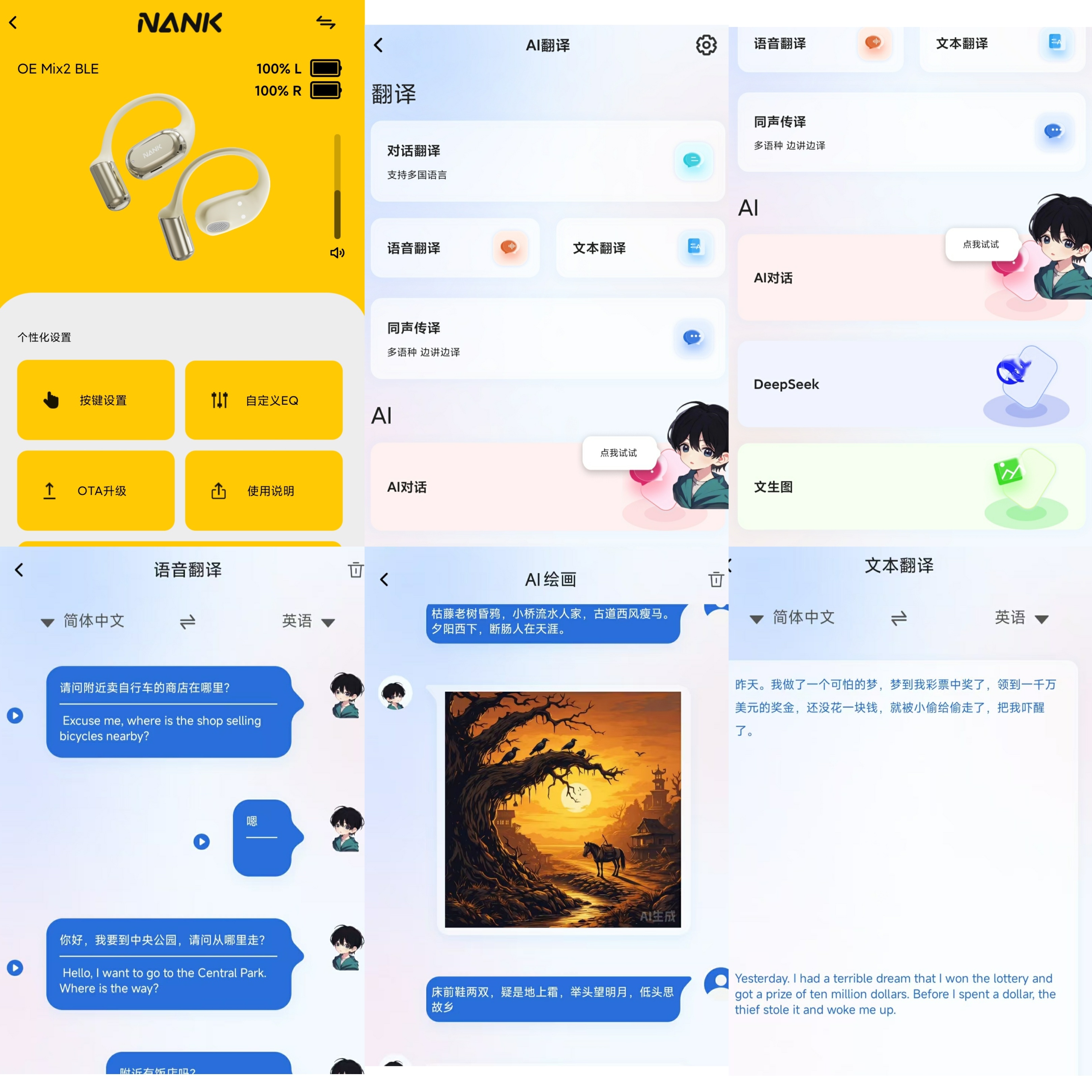 这样一副小小的耳机竟然也有了AI加持,使得NANK OE Mix2功能更全面,已进化到“会思考”的小配件,耳机不仅是听歌,更是贴身智能助理,会翻译、聊天、还能画图。由于内置集成讯飞、DeepSeek等AI能力,它支持了语音助手、AI对话、AI翻译、AI画图、AI写作,AI深度搜索,以及写作、翻译、情绪识别、内容生成等数十项AI能力。