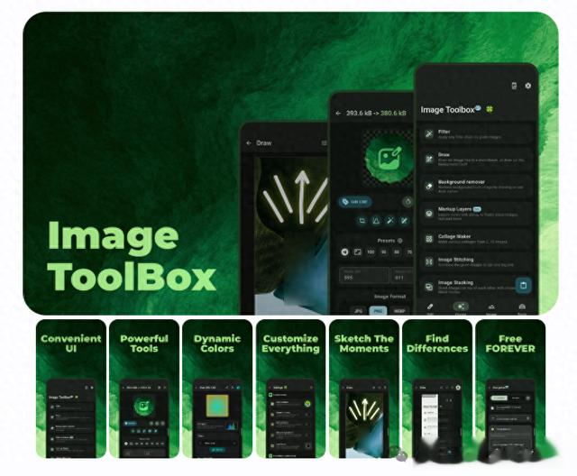 • 批量处理:应用滤镜链(超230种多样化滤镜)、文件加密解密、文本提取(支持120多种语言)。• 编辑工具:裁剪、绘制、添加贴纸和文字、去除背景(手动或自动)。• 格式转换:支持 HEIF、HEIC、AVIF、WEBP 等多种图像格式之间的转换。• PDF 工具:将 PDF 转换为图像或将图像合并为 PDF,支持文档扫描和二维码生成。• 增强功能:滤镜自定义、图像拼接/分割、图像压缩、透视校正等。• UI 定制:动态主题颜色、暗黑模式、可选字体样式,甚至还有烟花彩带效果。• 技术支持:基于 Kotlin 和 Jetpack Compose,快速响应、稳定可靠。如何开始1. 下载安装:• 前往 GitHub Releases 页面 下载最新的 APK 文件。2. 安装依赖:• 克隆项目代码:git clone https://github.com/yourusername/ImageToolbox.git• 使用包管理器(如 Gradle)安装依赖项。3. 构建项目:• 运行命令:./gradlew build4. 运行应用:• 使用命令:./gradlew run 即可体验强大的图像处理功能。为什么选择 Image Toolbox?Image Toolbox 不仅功能丰富,还完全免费,支持开放源码项目。通过它,您可以轻松高效地完成复杂的图像任务。