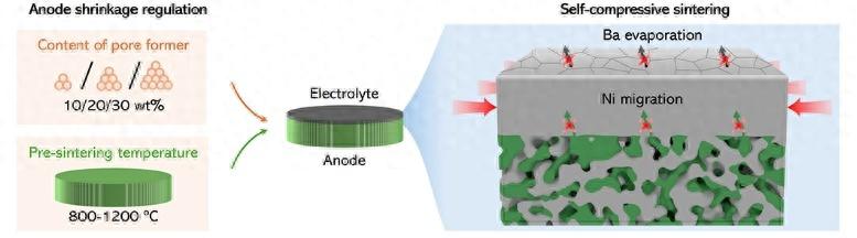 团队通过两个关键“调控旋钮”,精准“驾驭”自压缩应力促进共烧结。一个是孔隙调控,在阳极支撑体中加入淀粉造孔剂(含量达30wt%),增加其收缩潜力;另一个是预烧调控,将阳极支撑体在相对较低的900℃进行预烧结,保留其大部分收缩能力。