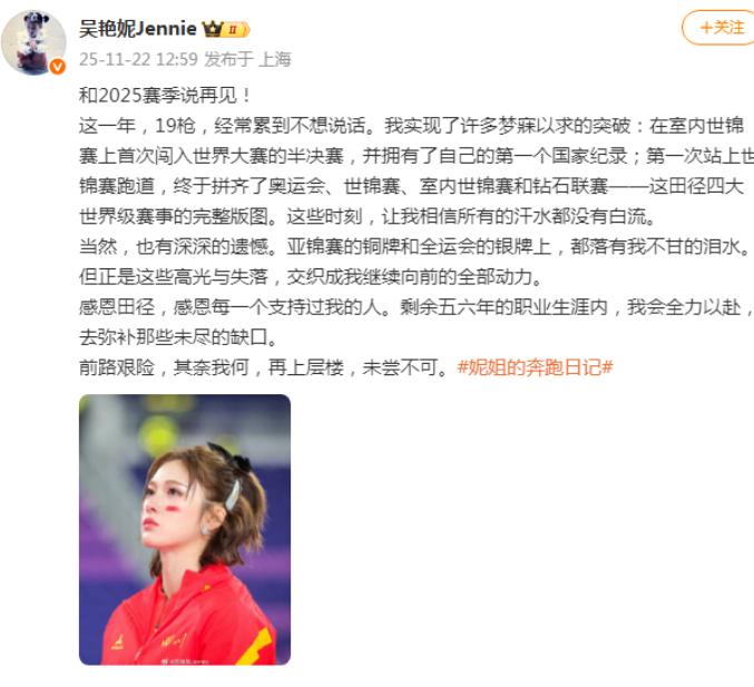 和2025赛季说再见!这一年,19枪,经常累到不想说话。我实现了许多梦寐以求的突破:在室内世锦赛上首次闯入世界大赛的半决赛,并拥有了自己的第一个国家纪录;第一次站上世锦赛跑道,终于拼齐了奥运会、世锦赛、室内世锦赛和钻石联赛——这田径四大世界级赛事的完整版图。这些时刻,让我相信所有的汗水都没有白流。当然,也有深深的遗憾。亚锦赛的铜牌和全运会的银牌上,都落有我不甘的泪水。但正是这些高光与失落,交织成我继续向前的全部动力。感恩田径,感恩每一个支持过我的人。剩余五六年的职业生涯内,我会全力以赴,去弥补那些未尽的缺口。