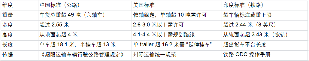 不同国家 / 地区对 ODC 的判定标准存在差异,国内以公路运输为核心,国际则侧重多模式运输适配性,具体如下表: