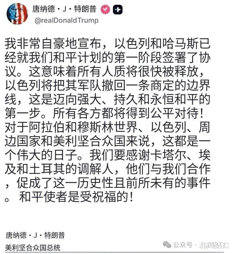 特朗普在社交媒体宣布,以色列和哈马斯签署和平计划的第一阶段。这意味着所有人质将很快获释,以色列将撤军至双方商定的边界线,这是迈向强大、持久和永恒和平的第一步。