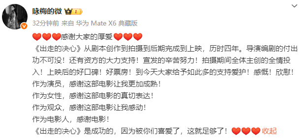 咏梅在文中写道:“感谢大家的厚爱!《出走的决心》从剧本创作到拍摄到后期完成到上映,历时四年。导演编剧的付出功不可没!还有资方的大力支持!宣发的辛苦努力!拍摄期间全体主创的全情投入!上映后的好口碑!好票房!到今天大家给予如此多的支持爱护!感慨!欣慰!