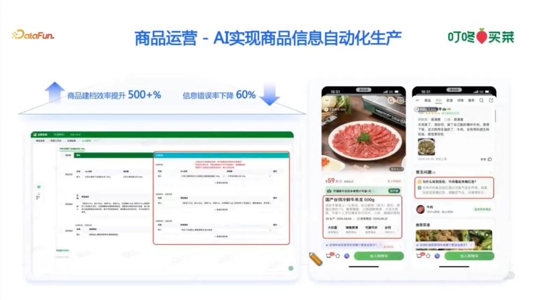 由于叮咚买菜的商品全部是上架自营平台,因此商品上架需经过复杂的商品上架信息录入系统。这些信息包括图片、视频、文本等,有的由供应商提供,有的由叮咚买菜员工自行整理。最终,这些信息需转化为结构化知识。之前,这项工作由人负责,工作量大且常出错。例如,曾出现将山药的长度从 20 多厘米误录为 20 多米的错误。尽管有规则可遵循,但仍会有意想不到的错误,这些错误无法全部罗列。在使用大模型后,系统能自动识别并录入信息,显著提高了效率和准确性,降低了错误率。通过对大模型的使用,叮咚买菜在商品结构信息化方面取得了很大收益。