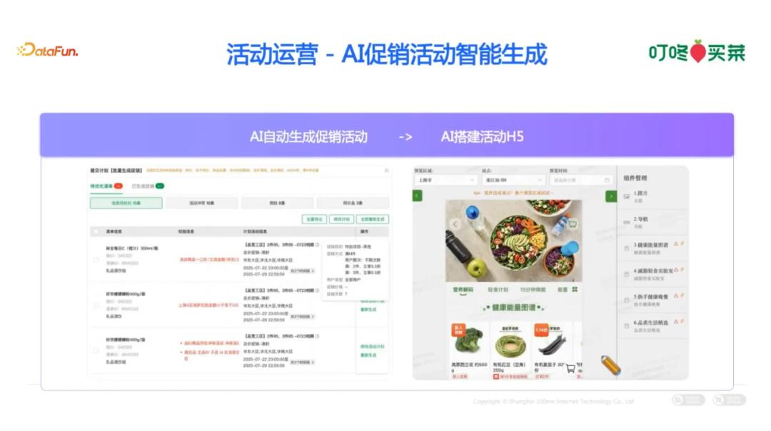 在促销活动搭建环节,从商品选品、折扣策略制定、活动 H5 页面自动生成到商家扣点核算等全流程,均已实现前端页面生成的自动化操作。这样,运营人员只需决定折扣力度和活动量,甚至后续这些决策也可以交给 AI 来完成,运营人员只需向 AI 提供的活动目标和上下文信息,即可实现自动化生成。