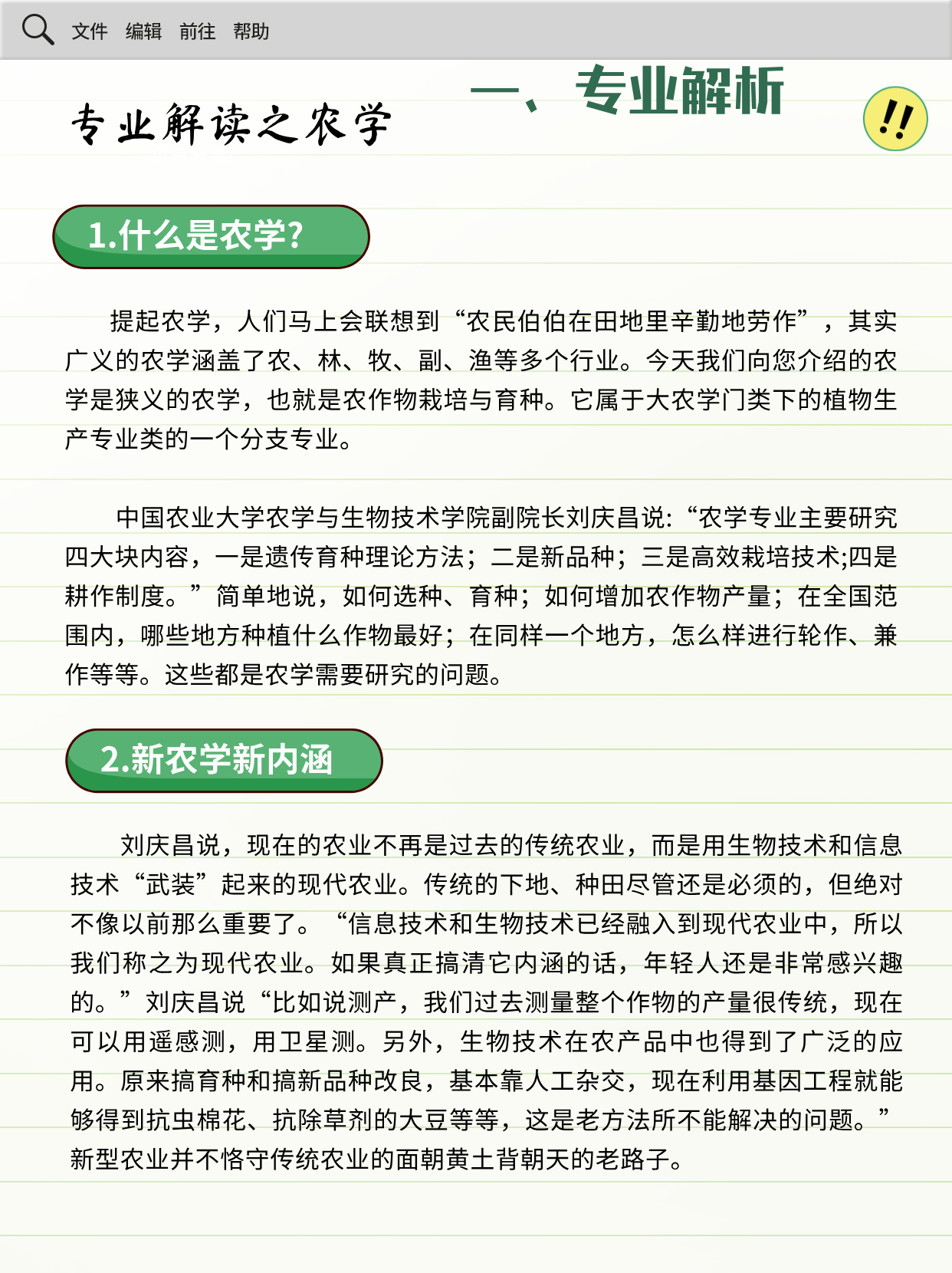 二、新农学新内涵刘庆昌说,现在的农业不再是过去的传统农业,而是用生物技术和信息技术“武装”起来的现代农业。传统的下地、种田尽管还是必须的,但绝对不像以前那么重要了。“信息技术和生物技术已经融入到现代农业中,所以我们称之为现代农业。