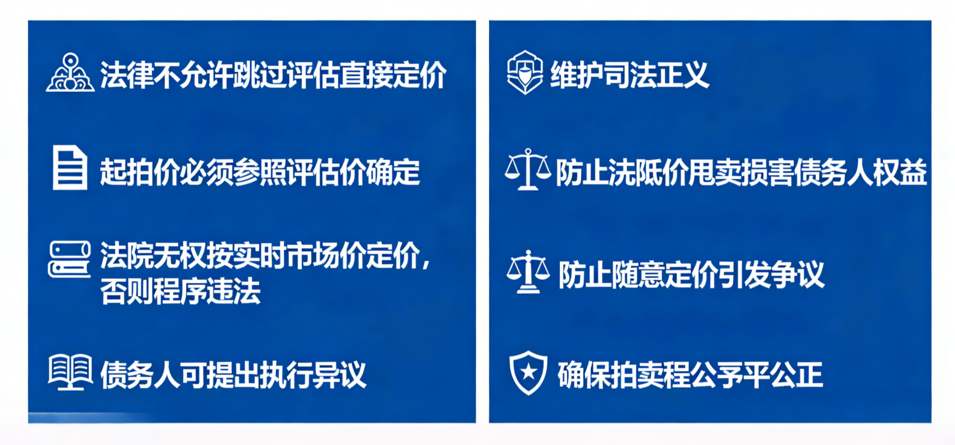 第三,法律不允许跳过评估直接定价。 根据最高法规定,起拍价必须“参照评估价确定”。法院无权按实时市场价定价,否则程序违法,债务人可以提出执行异议。这套制度设计的初衷,正是为了维护司法正义——既防止法院低价甩卖损害债务人权益,也防止随意定价引发争议,确保拍卖程序的公平公正。