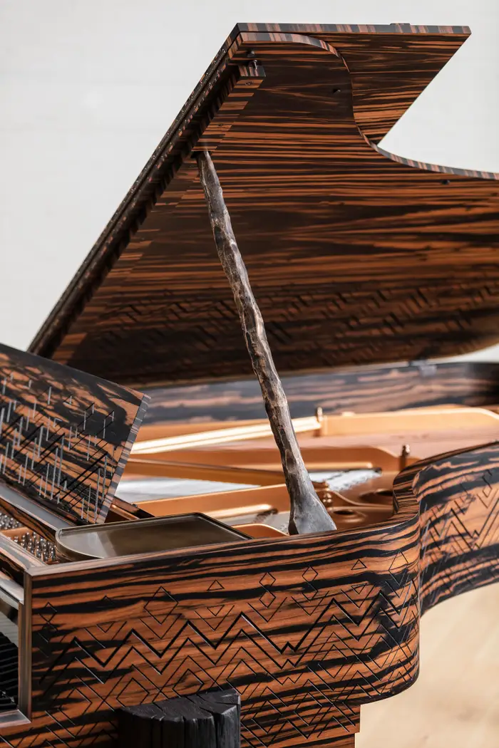 🌈 定制细节这架钢琴的每一部分都是精心定制的:黑檀木的表面,实心青铜铸造的琴顶鼓和踏板,乌木和哑光菩萨色的钢琴键,以及望加锡乌木和仿猎豹图案的长凳。每个细节都彰显着奢华与个性。🔩✨