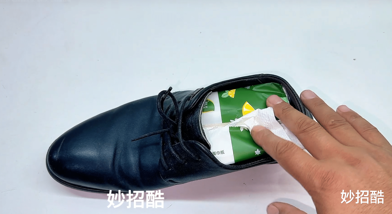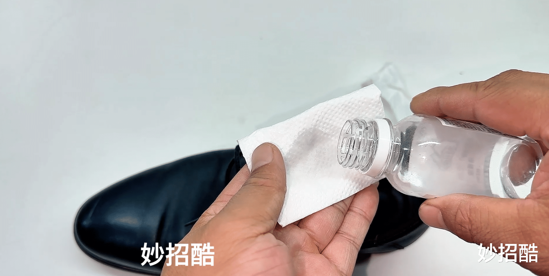 如果是皮鞋挤脚的情况下,一般都是鞋帮处变硬。这时只需准备两张纸巾,在纸巾表面倒入一点酒精,再把纸巾放到鞋子的边缘。
