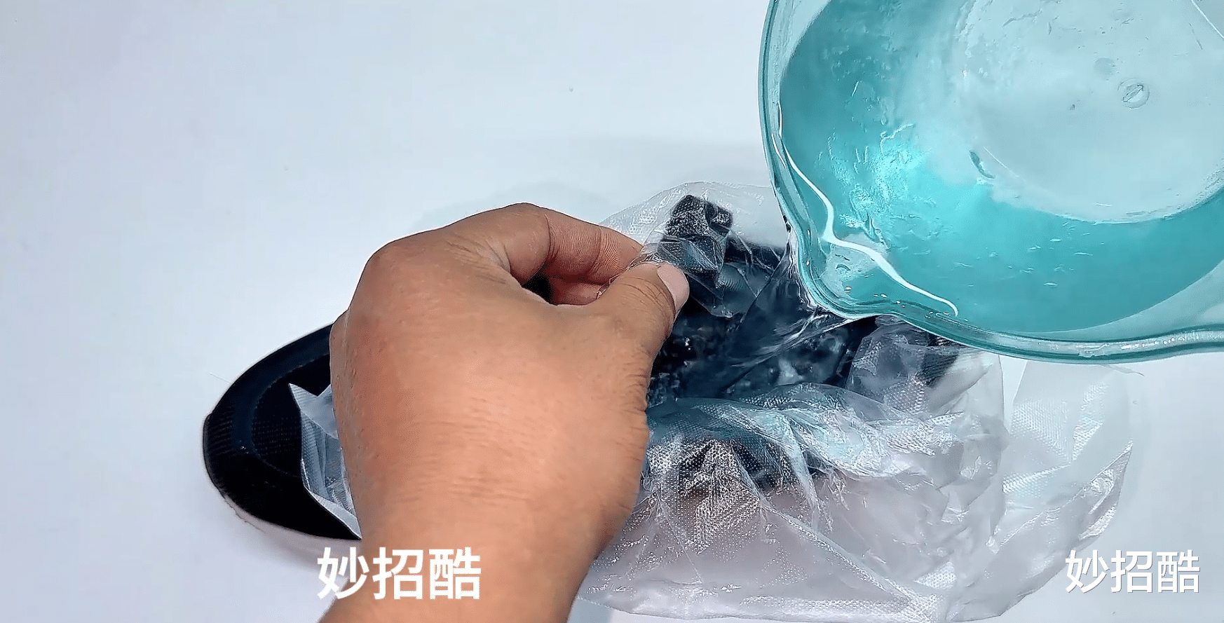 首先准备一个塑料袋,塑料袋千万不能漏水,接着塑料料袋放进鞋子的内部,然后在塑料袋内部加入清水。加清水时,一定要加满,接着把塑料袋捆扎紧口。