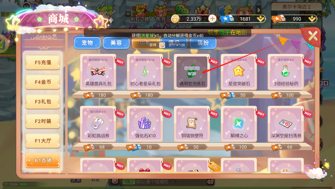 2·在商城的百货一栏中的通用洗练石每日限购二十个,仅需要花费绑点就可以购买,这是每天必须要购买的材料,用作装备附魔的必备材料,也是稳定提升属性的重要方式。