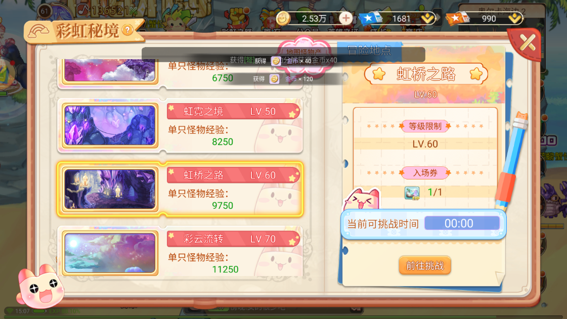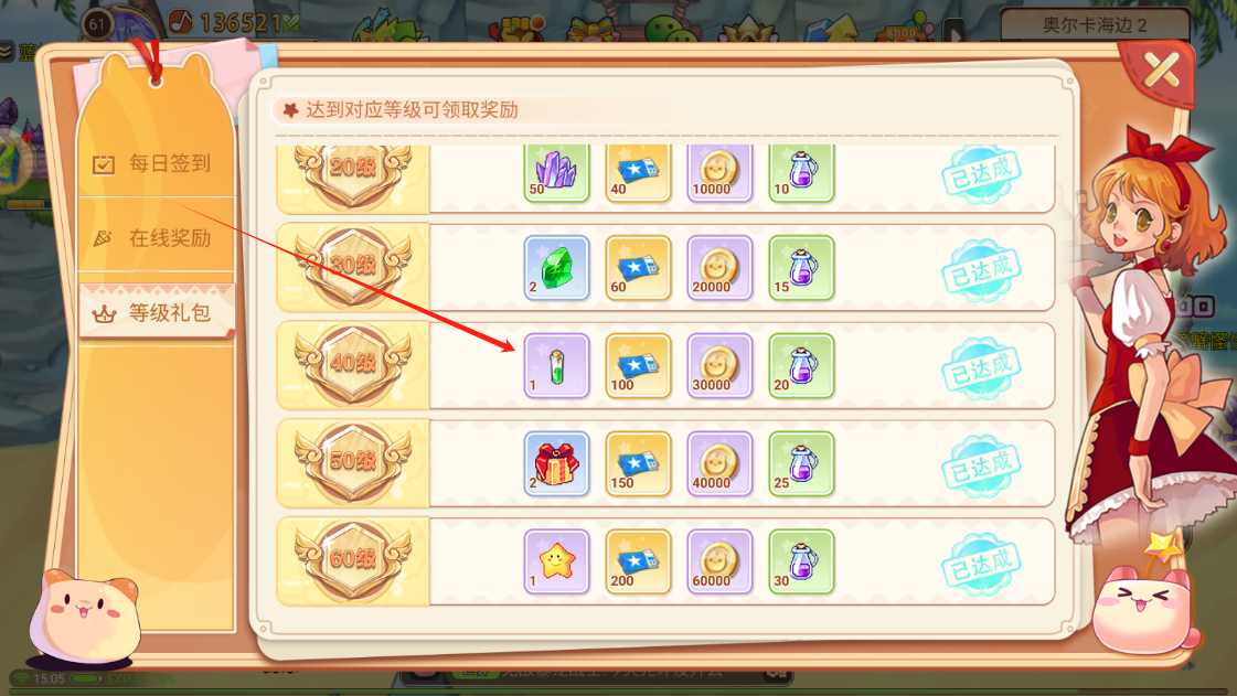 这个时候我们直接进入后直接退出,然后去三十级怪物处挂机刷黄铜套装,刷到黄铜套装后去做日常任务的试炼任务,这个时候的经验大概是正好升到四十级,完成日常活跃30后可以领取一张秘境挑战令,然后在福利页面领取等级经验药水,使用经验药水后直接进入彩虹秘境。这样所获得经验才是最大化的。
