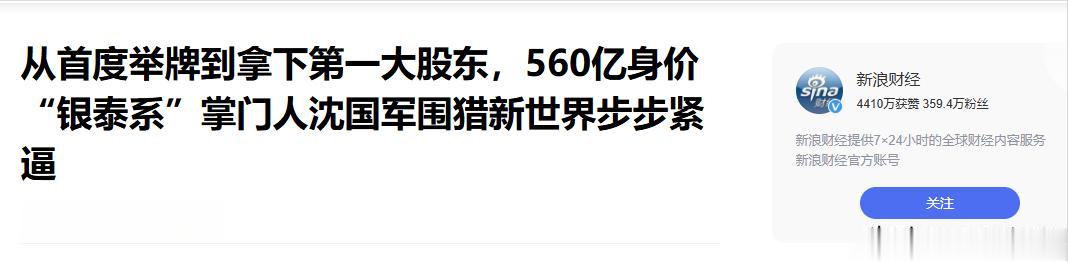 新浪财经——从首度举牌到拿下第一大股东,560亿身价“银泰系”掌门人沈国军围猎新世界步步紧逼