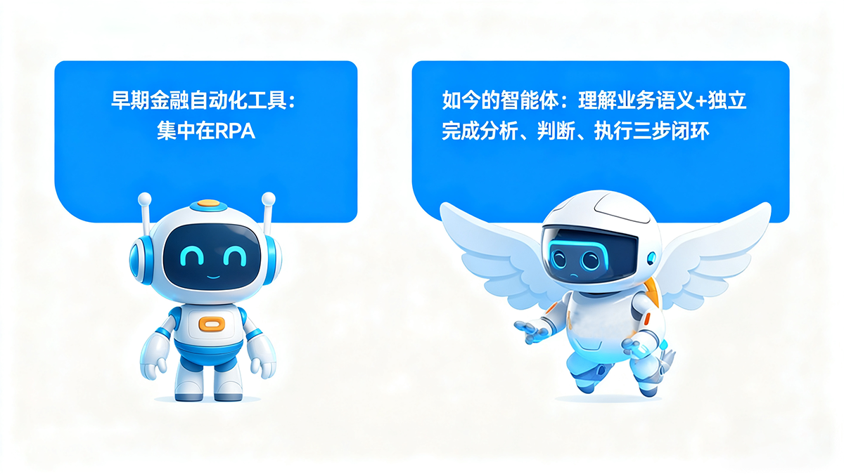 早期的金融自动化工具大多集中于RPA流程执行和数据采集。如今的智能体则更进一步,能在理解业务语义的基础上,独立完成分析、判断、执行三步闭环。例如在资产配置、风控建模、舆情预警等高复杂度场景下,智能体不仅“执行任务”,更能动态学习与自我迭代,这意味着它从“脚本机器人”升级成了“智能员工”。