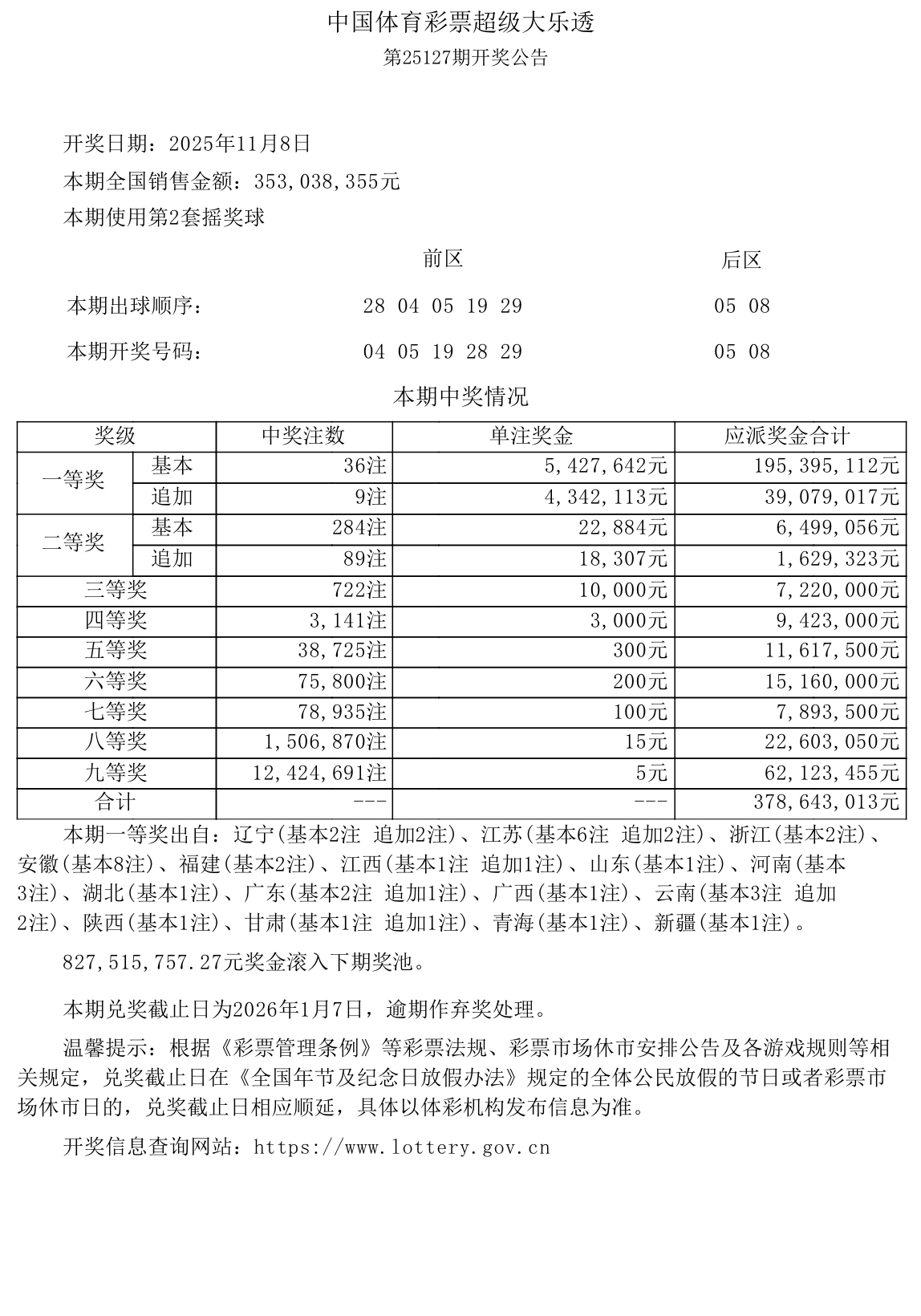 体彩超级大乐透②⓪②⑤127期开奖公告