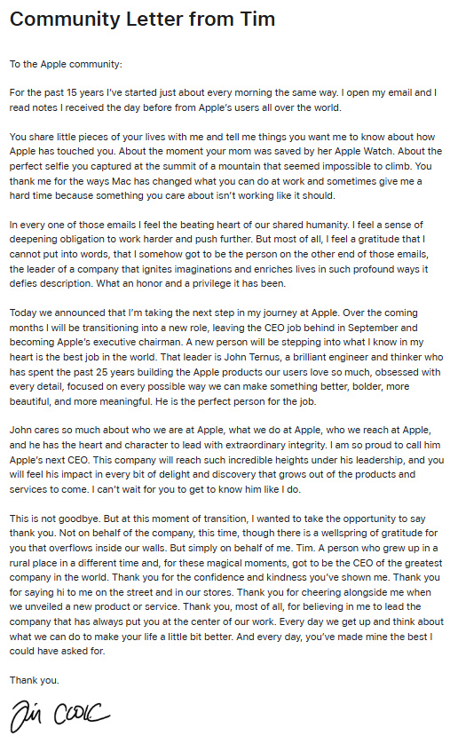 苹果公司称,库克将转任执行董事长,不再担任首席执行官一职,此次人事任命自9月1日起正式生效。这是苹果自2011年以来首次进行CEO换届。现年65岁的库克是在史蒂夫·乔布斯去世前不久接任公司掌舵人的,而特努斯将成为苹果第八任首席执行官。