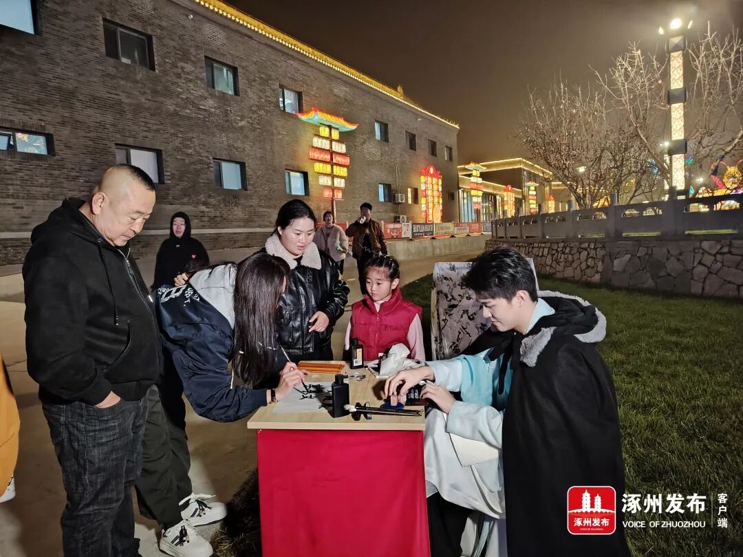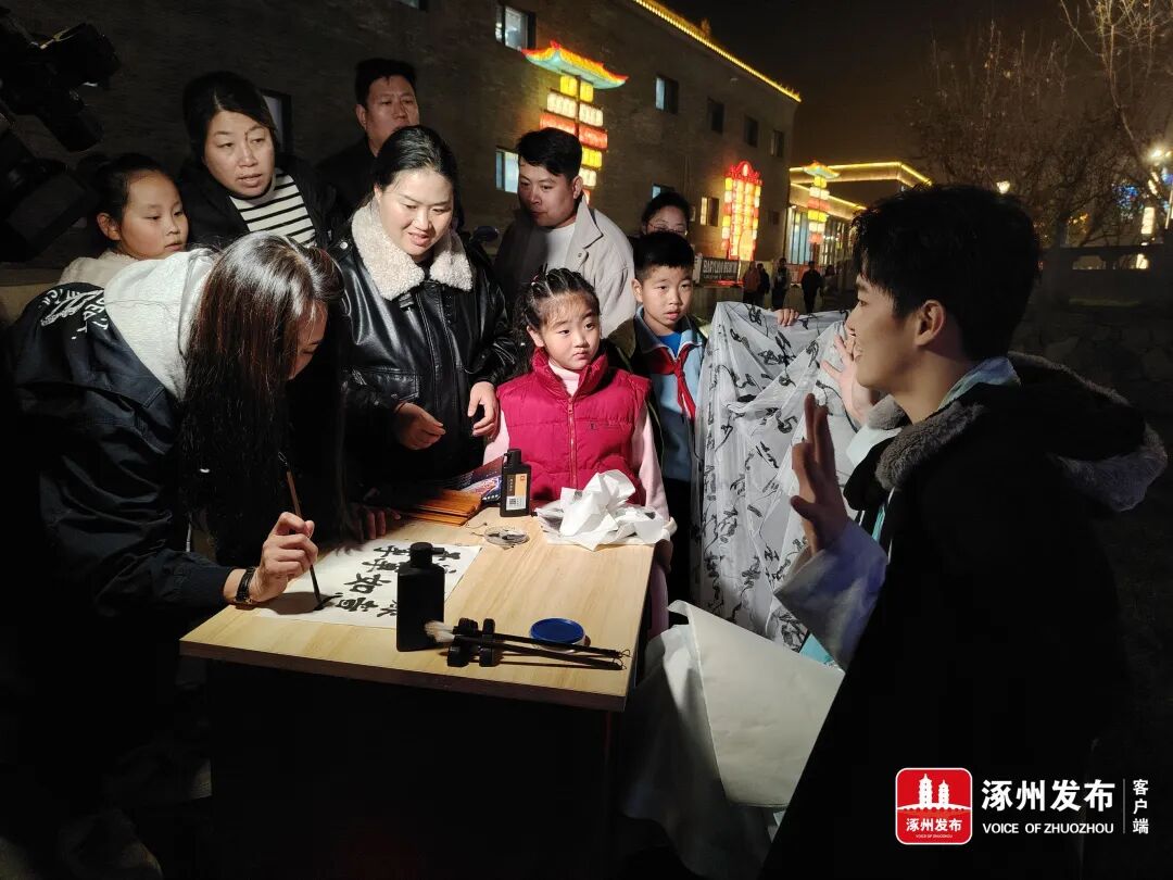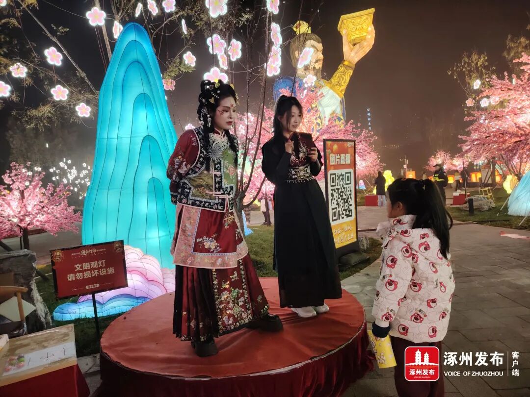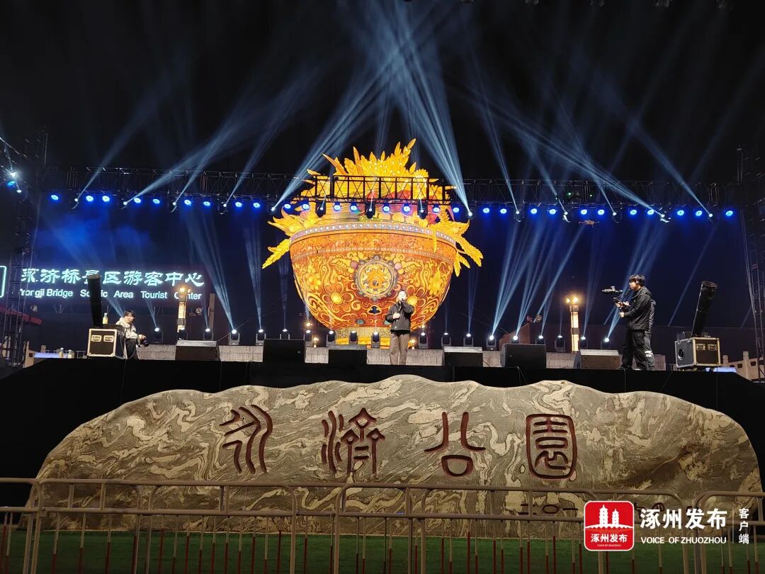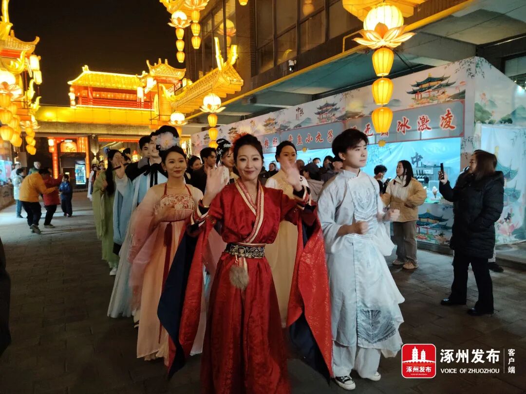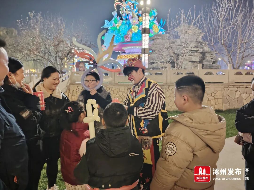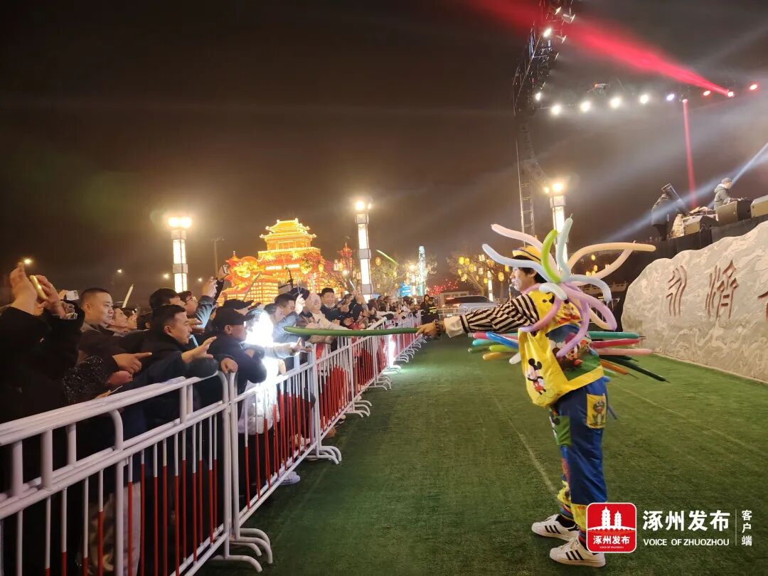 华灯初上,通会灯市原创歌曲《涿水长歌》激情唱响。通会灯市大舞台上,赵家班神秘嘉宾莅临演出,幽默诙谐的语言令人捧腹大笑,精彩的歌舞表演令现场观众连连喝彩,大家纷纷拿起手机记录这欢乐的时光。不少游客和表演嘉宾一起唱歌并握手互动,现场气氛燃爆。