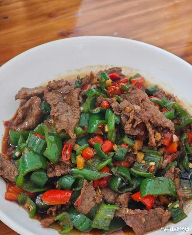 小炒牛肉,看起来很家常,牛肉切得薄薄而大片,和青椒,小米椒一起爆炒,吃起来牛肉香气十足,鲜嫩弹牙。