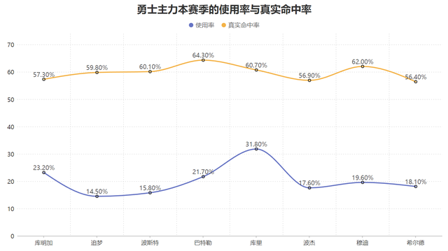 那么有私心代表什么呢?可以理解为个人的数据发展大于球队的胜负,本赛季勇士八名主力里使用率最高的是库里与库明加,这意味着此二人消耗了球队最多的出手机会,同时穆迪与库里有着最高的结合三分罚球情况的真实命中率,消耗出手机会更多单独来看并不是错误的,如果得分效率不足才值得诟病。