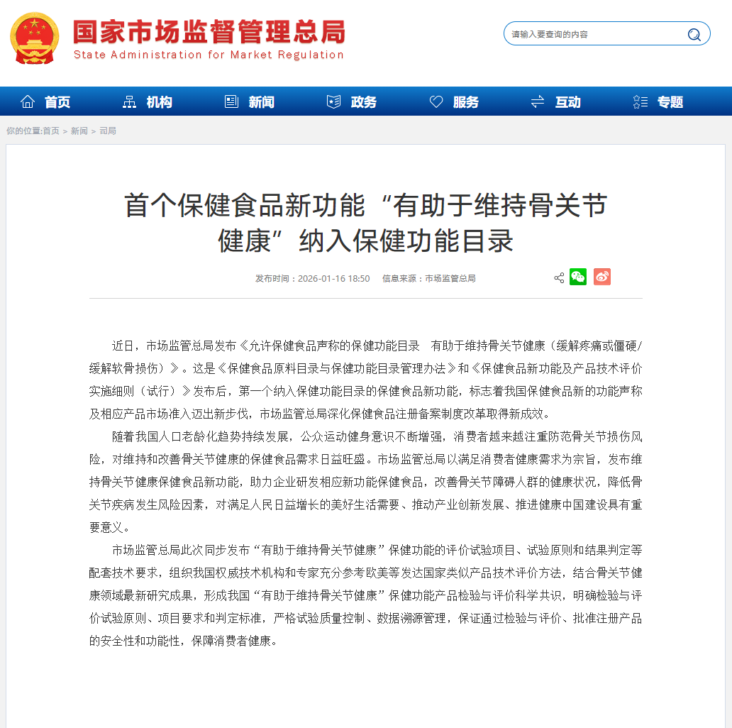 近日,国家市场监督管理总局正式发布《允许保健食品声称的保健功能目录 有助于维持骨关节健康(缓解疼痛或僵硬/缓解软骨损伤)》。这是我国保健食品管理制度改革以来,首个纳入保健功能目录的“新功能”。该政策的落地,不仅标志着我国骨关节健康食品的市场准入迈出了科学化、精准化的一步,也为以氨糖(氨基葡萄糖)和软骨素为核心成分的保健食品企业,带来了全新的发展机遇与挑战。