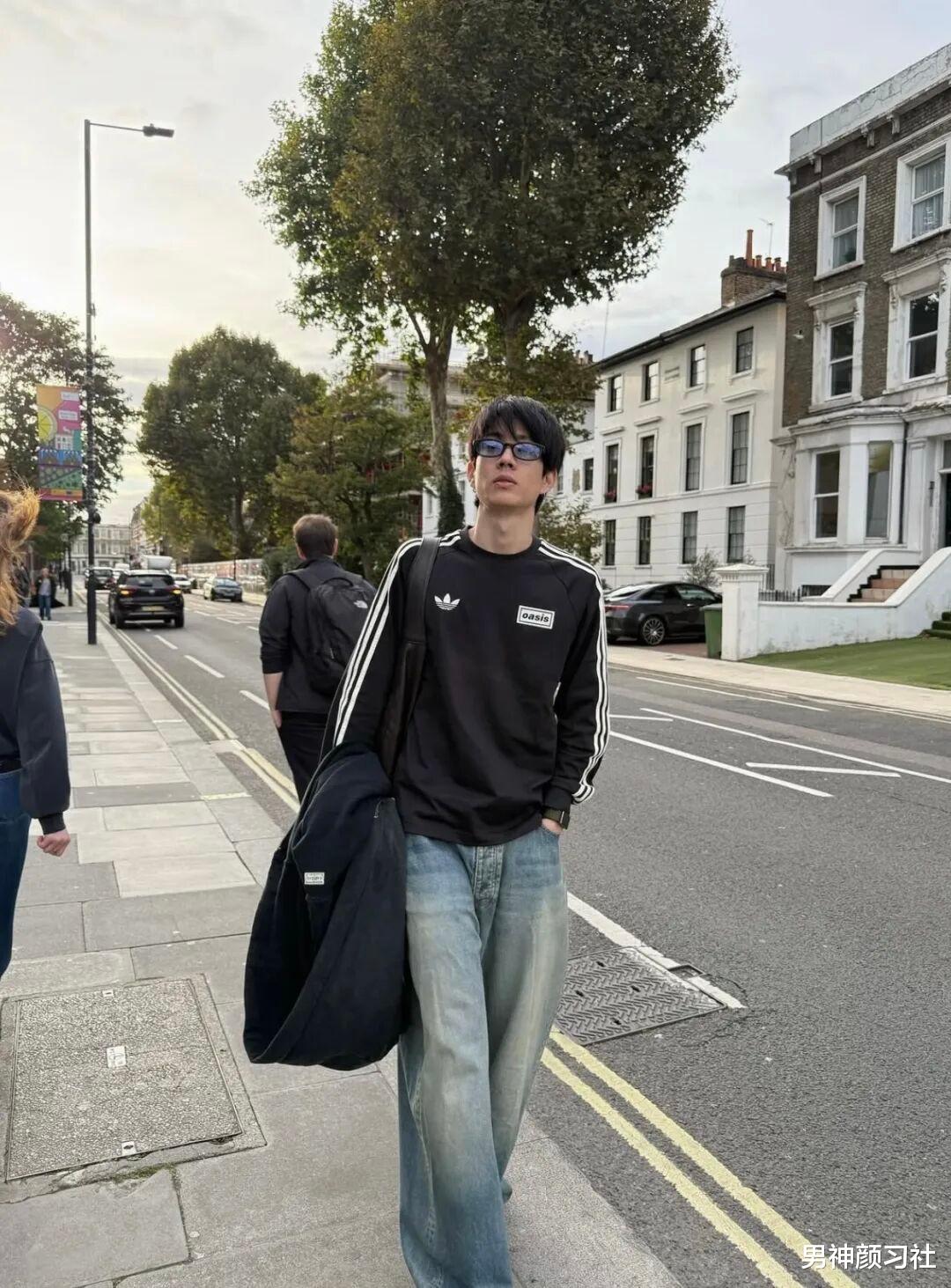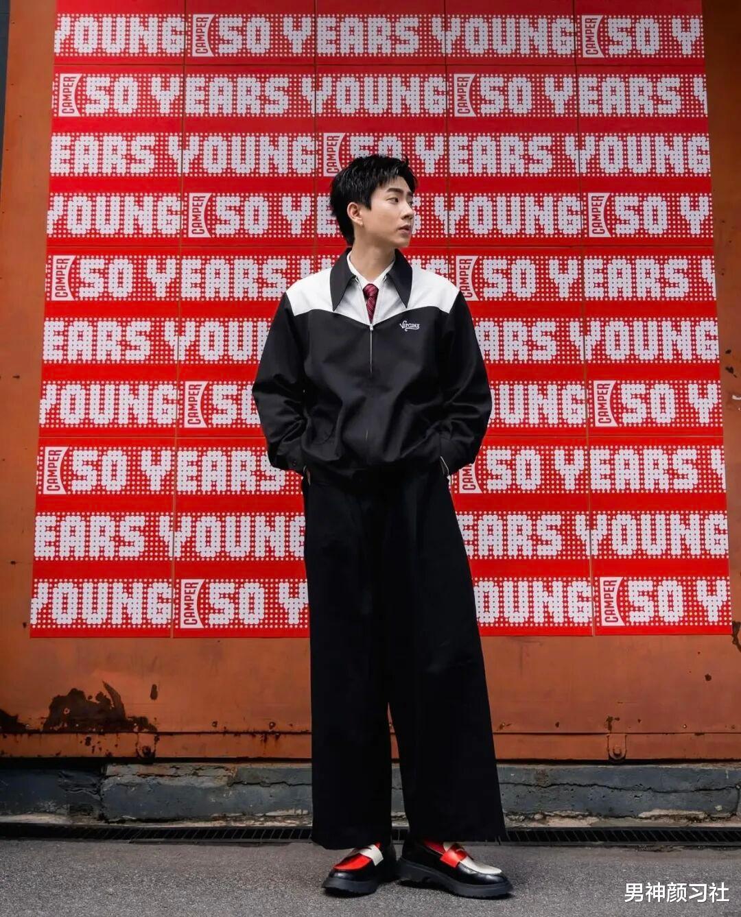 他也经常穿黑白相间的夹克,搭配宽松的黑裤子和拼色乐福鞋。一身黑白,却一点也不闷——鞋子的拼色和裤型的松弛感让整个人轻盈了起来。