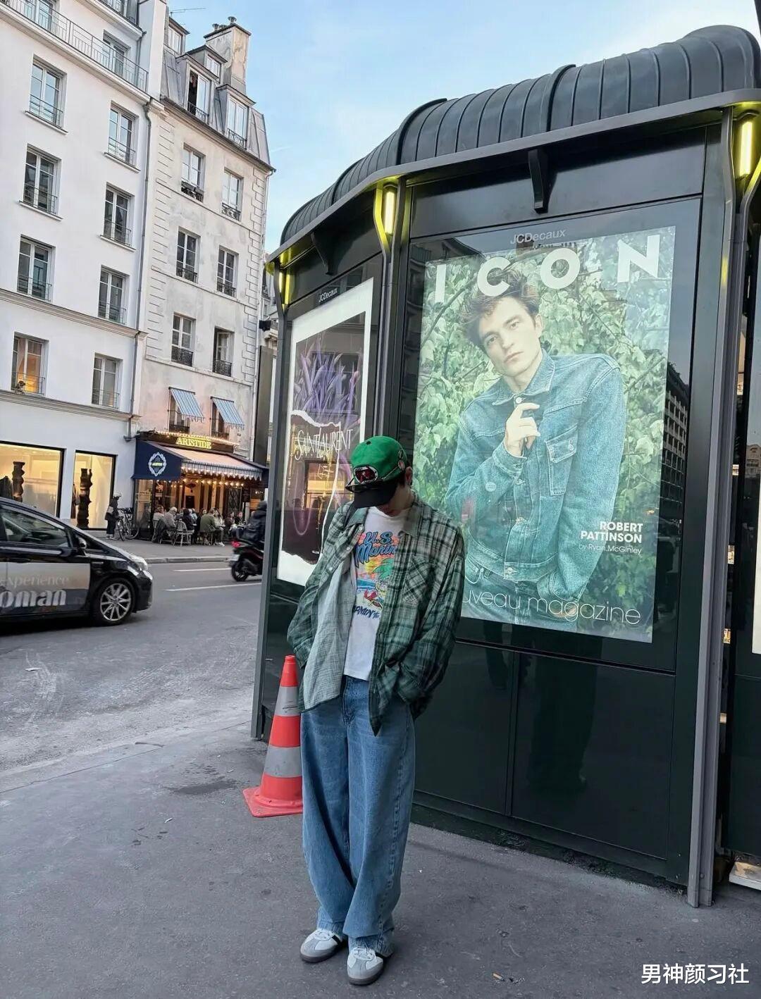 他也不害怕颜色。比如他那件粉色雪花外套,配牛仔裤,再加一双红鞋,看似难驾驭的颜色,在他身上变得很自然。原因是比例对了:亮色外套、基础裤装、呼应色鞋子,三者形成平衡,不突兀反而亮眼。