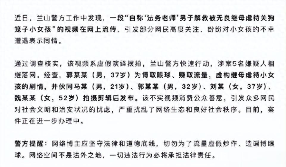 经查,郭某某(男,37岁)为博取眼球、赚取流量,虚构继母虐待小女孩的剧情,并伙同马某(男,21岁)、郭某某(男,32岁)、刘某(女,37岁)、魏某某(女,52岁)拍摄剪辑后发布。该不实视频消费公众善意,引发众多网民对社会文明和治安状况的忧虑,严重扰乱了网络生态和良好社会秩序。目前,案件正在进一步办理中。