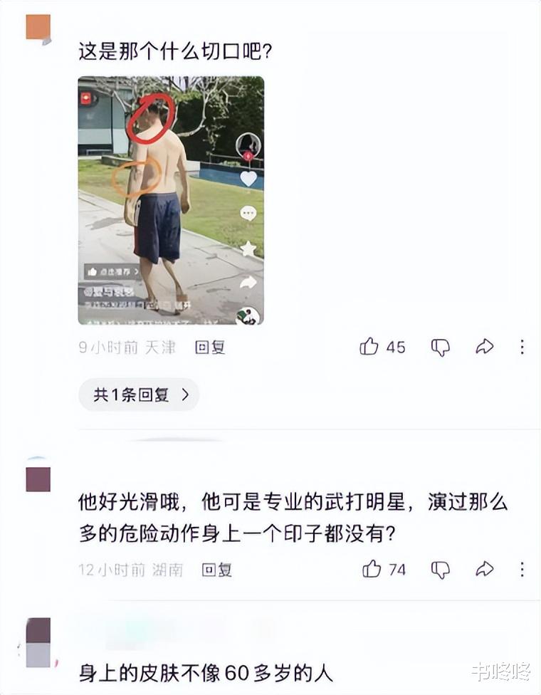 评论区的网友开始用放大镜观察,无痕手术、肚脐变位、伤口消失,还有武打演员没有疤痕这些细节,全揪出来分析个遍。