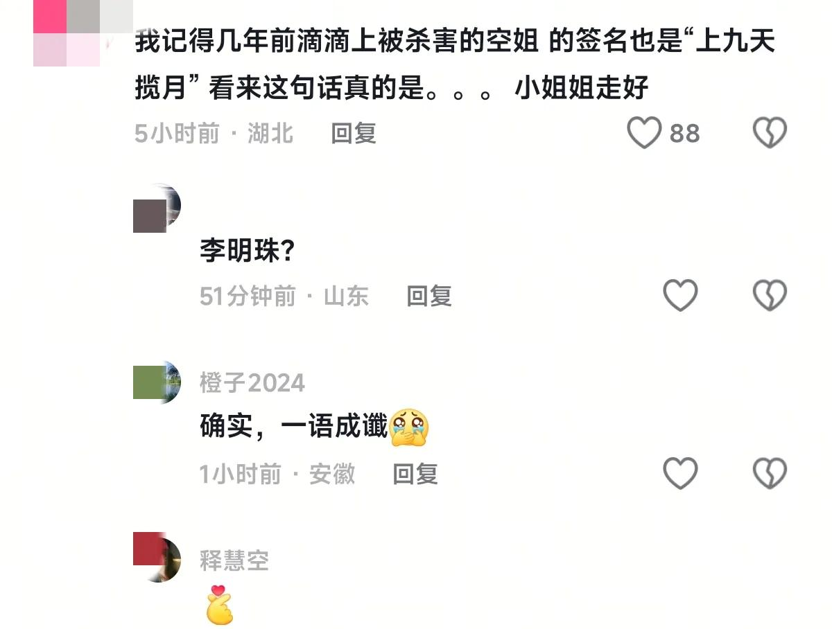 在急诊室监控画面外,千万网友正经历着集体性的记忆闪回。有人翻出2000年元旦的报纸特刊,泛黄版面里襁褓中的千千与世纪钟声同框;有人找出她2023年的潜水视频,阳光穿透海水在她发梢跳跃的鲜活画面;更有人发现,五年前震惊全国的滴滴空姐案受害者,社交签名竟同样写着"可上九天揽月"。这些碎片在网络时空里碰撞重组,构建出令人窒息的宿命感。