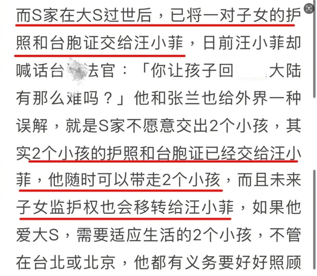 台媒曾报道,S家已将孩子的相关证件交给了汪小菲,这似乎为孩子们回北京铺平了道路。