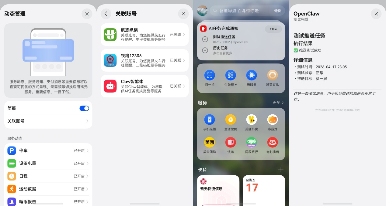 先说一个特别省心的场景。五一假期高峰,高铁车票难抢,在12306候补的时候总是时不时要去关注下自己有没有候补到,怕因为错过通知而误以为自己还没抢到票;现在出票信息会第一时间出现在负一屏顶部的服务动态卡片上,一秒同步,完全不用来回刷新。另外,这次负一屏版本更新后,顶部的服务动态卡片还支持Claw智能体,只需简单几步就能快速绑定你的“龙虾”,绑定后我再用“龙虾”处理任务,它在那边干活,AI任务完成通知就直接推到负一屏上,结果自动送到眼前。