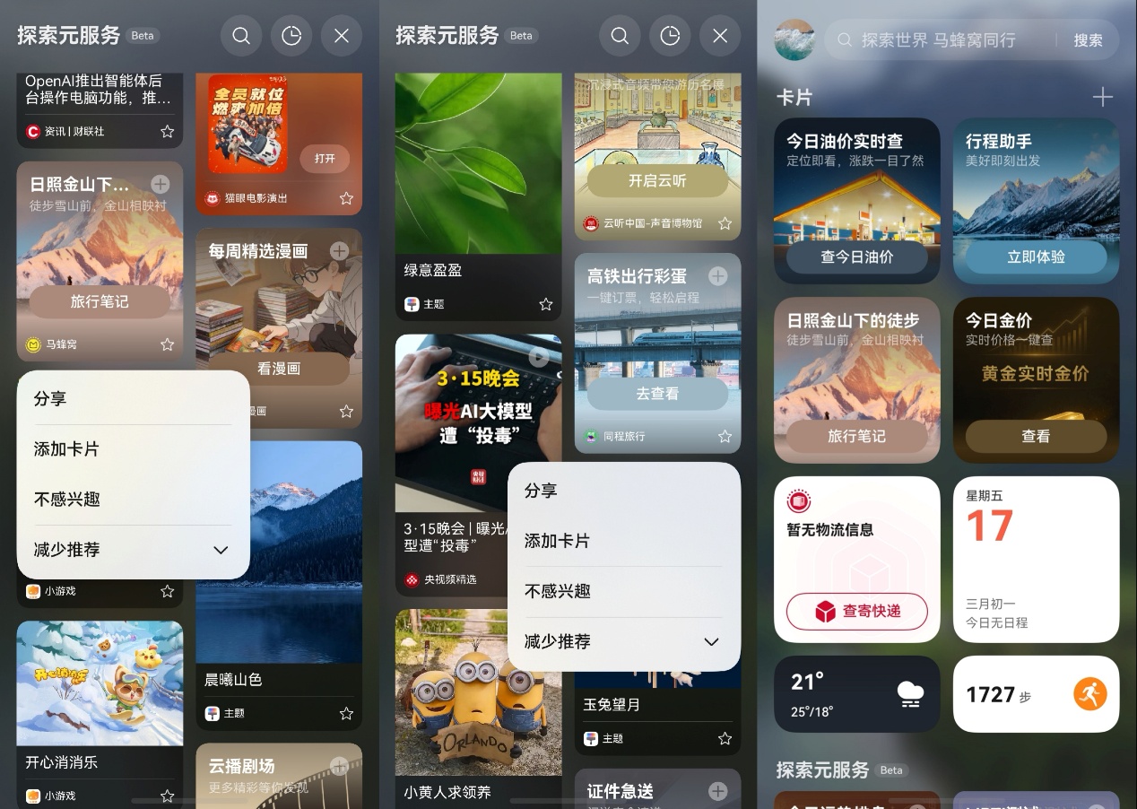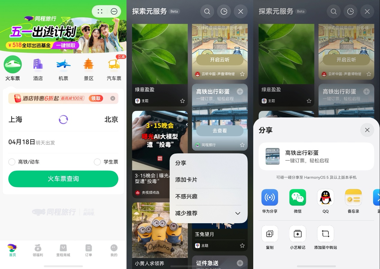 除了顶部的服务动态卡片外,另一个我比较喜欢的新功能就是“探索元服务”,从负一屏底部上滑即可进入,这儿更像一个服务自由市场。假期快到了,我在旅行频道随便逛,马蜂窝元服务推了几个不踩雷的目的地,旁边的同程旅行元服务顺手就把机票酒店定了。逛到好用的服务还能一键分享给朋友,组队出行的时候大家一起用,省得一个个教。同程旅行现在把火车票、机票、酒店全搬上了负一屏,华为用户还能领白金卡专属权益,包含价值360元的出行礼包和高铁机场贵宾厅,从规划到下单一条龙搞定。