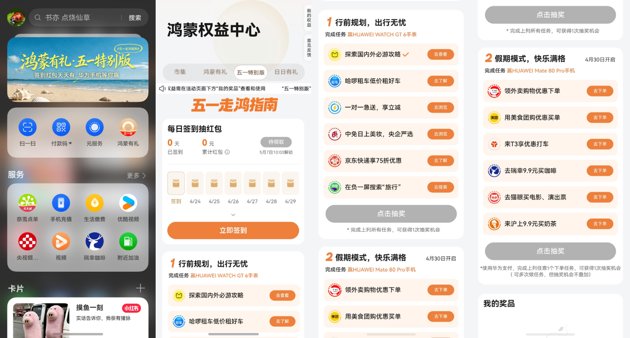 4月23日到5月7日,负一屏上线了五一走鸿指南活动。它把出行前规划到假期模式可能用到的服务提前排列好,参与还有机会赢得华为WATCH GT 6或最新华为Mate 80 Pro。