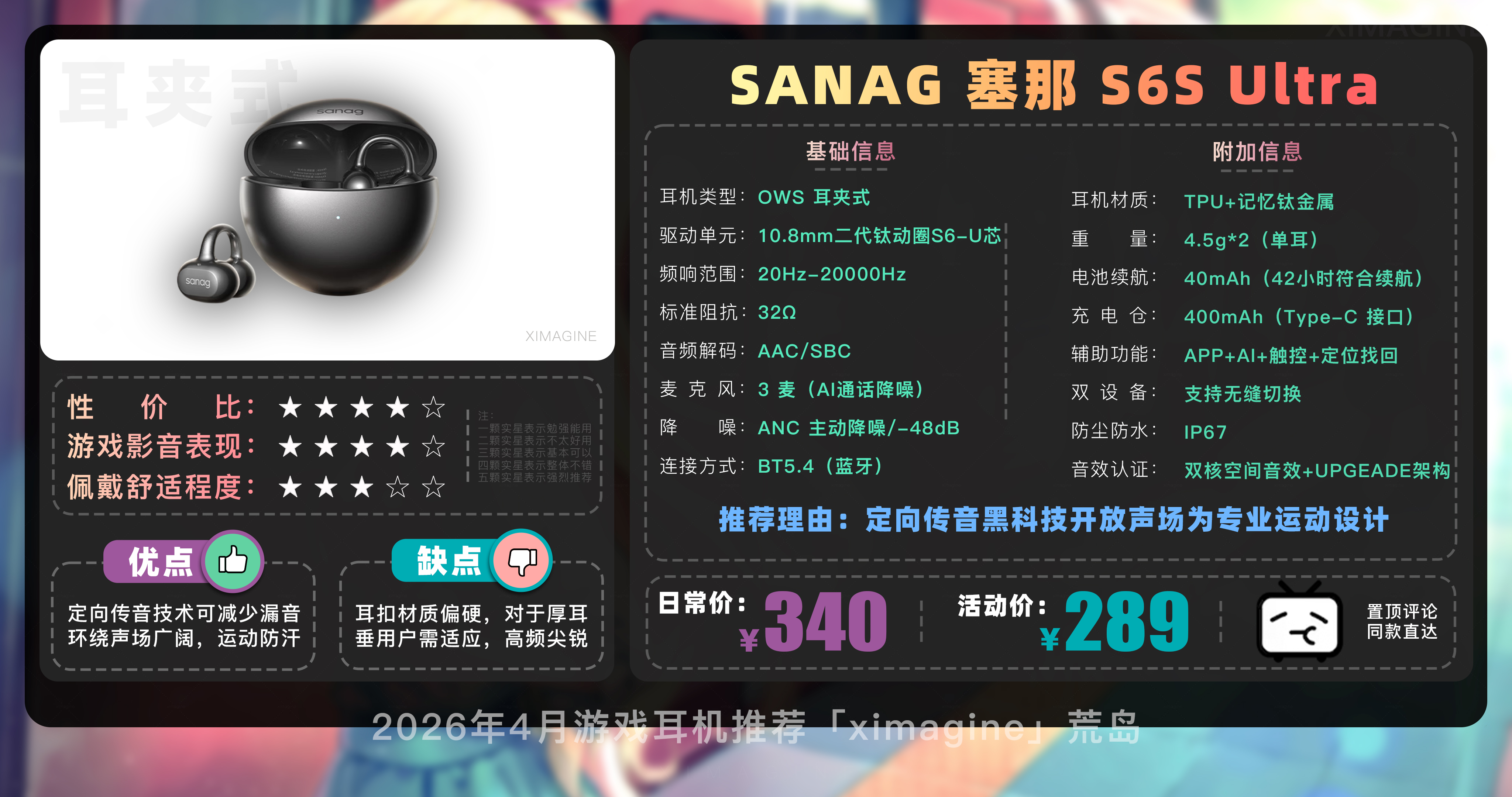 SANAG 塞那 S6S Ultra 搭载自研 SSQVP 数字声音增强技术,通过数字补偿提升开放式耳机的动态范围。机身采用 C 型桥弹性连接,通过符合耳廓结构的曲线实现稳固,配合磨砂质感外壳,单只耳机仅 4.5g 重,具备 IP67 级防水能力。在健身房进行力量训练或大幅度跳操时,能稳固抓附在耳廓上,动感的音效调校能瞬间激发运动热情,且汗水完全不会对耳机性能造成损伤。289 元的它适合重度运动玩家,对开放式耳机低音能量感有要求,且偏好稳固佩戴风格的用户。