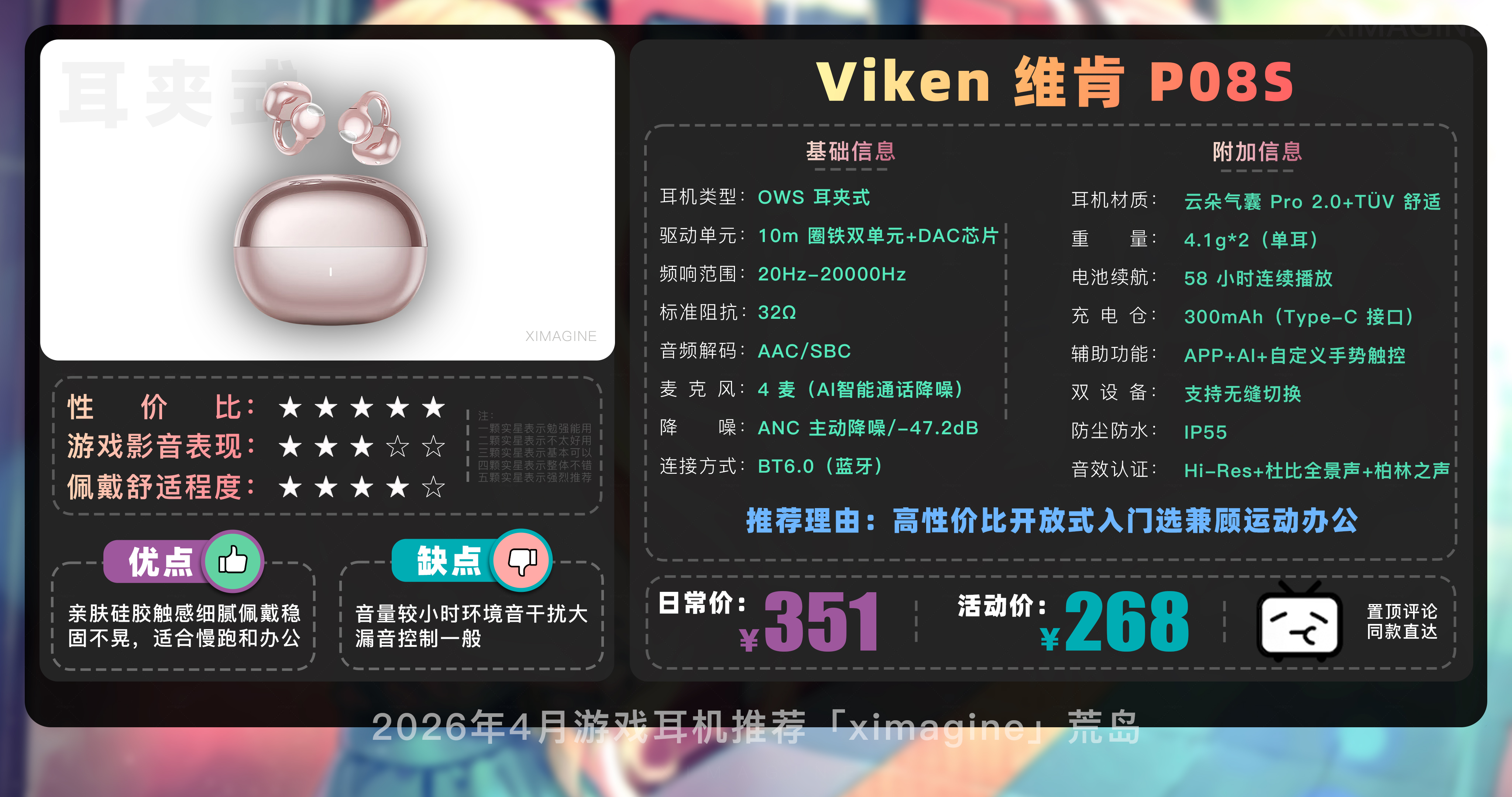 Viken 维肯 P08S 采用云朵气囊亲肤硅胶耳夹结构,内置蓝牙 6.0 芯片以保证连接稳定性,其发声单元位于耳屏外侧,通过定向声学技术引导音波。完全不塞入耳道解决传统耳机闷耳和细菌滋生问题,同时能保持对环境音的实时感知。在清晨公园跑步时既能聆听快节奏音乐,又能通过双耳捕捉到身后行人声音,这种开放性提升运动安全性,268 元的它适合想要尝试耳夹式结构,主要用于轻量级户外运动的入门用户。