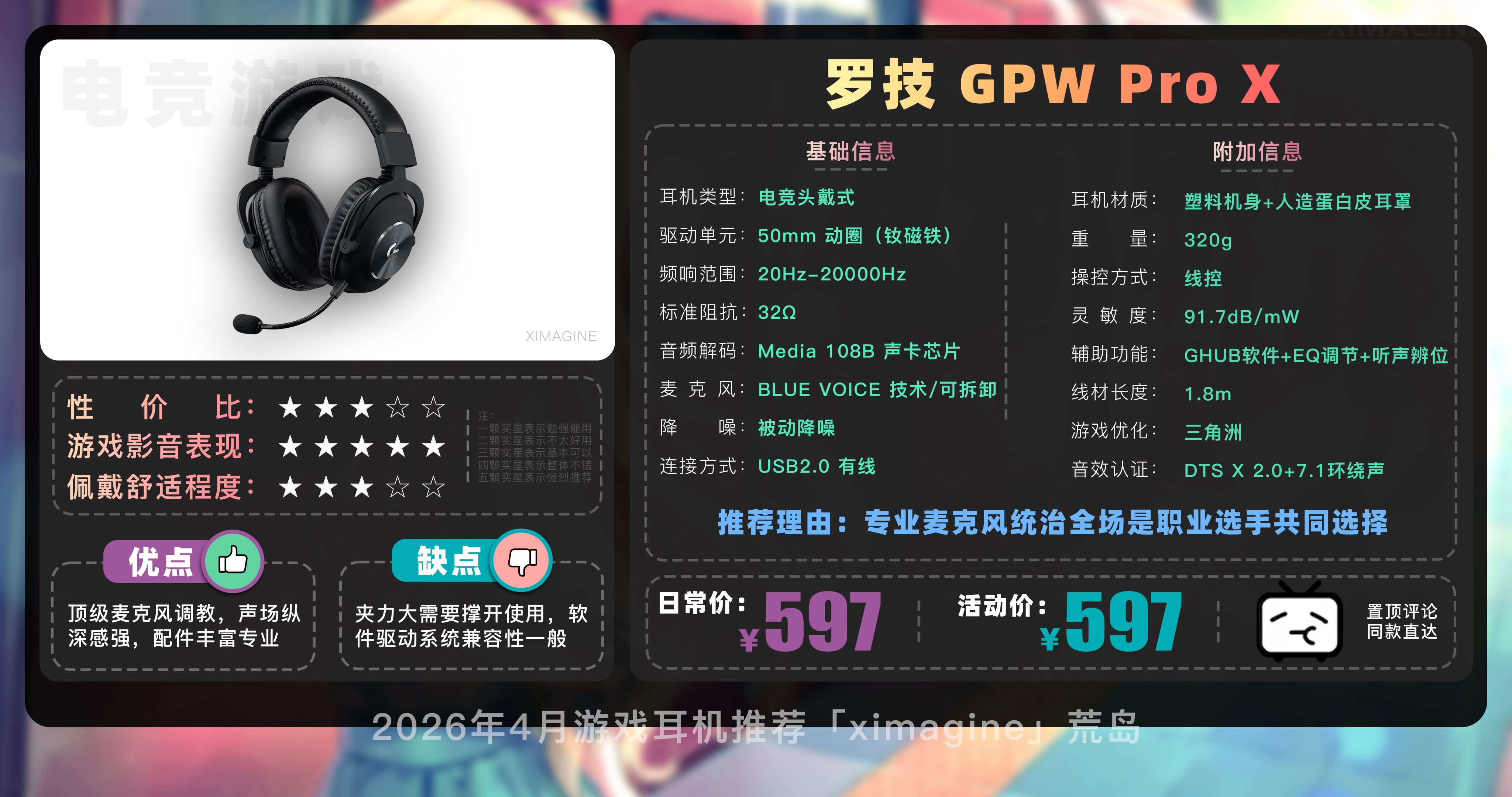 罗技 GPW Pro X 耳机集成 BLUE VO!CE 麦克风技术,允许用户通过驱动软件实现电台级的语音调节,声学采用50mm GPW 钕磁铁混合网格单元,提供清晰的细节深度,随附外置 USB 声卡支持保存自定义 EQ 预设。作为团队指挥,能确保每一声指令都饱满有力,通过更换皮质或织物耳罩,能适应不同季节的舒适需求。597 元的它是专为竞技场设计的工具,专业化程度很高,适合对麦克风通话质量和软件调教有要求的职业选手。
