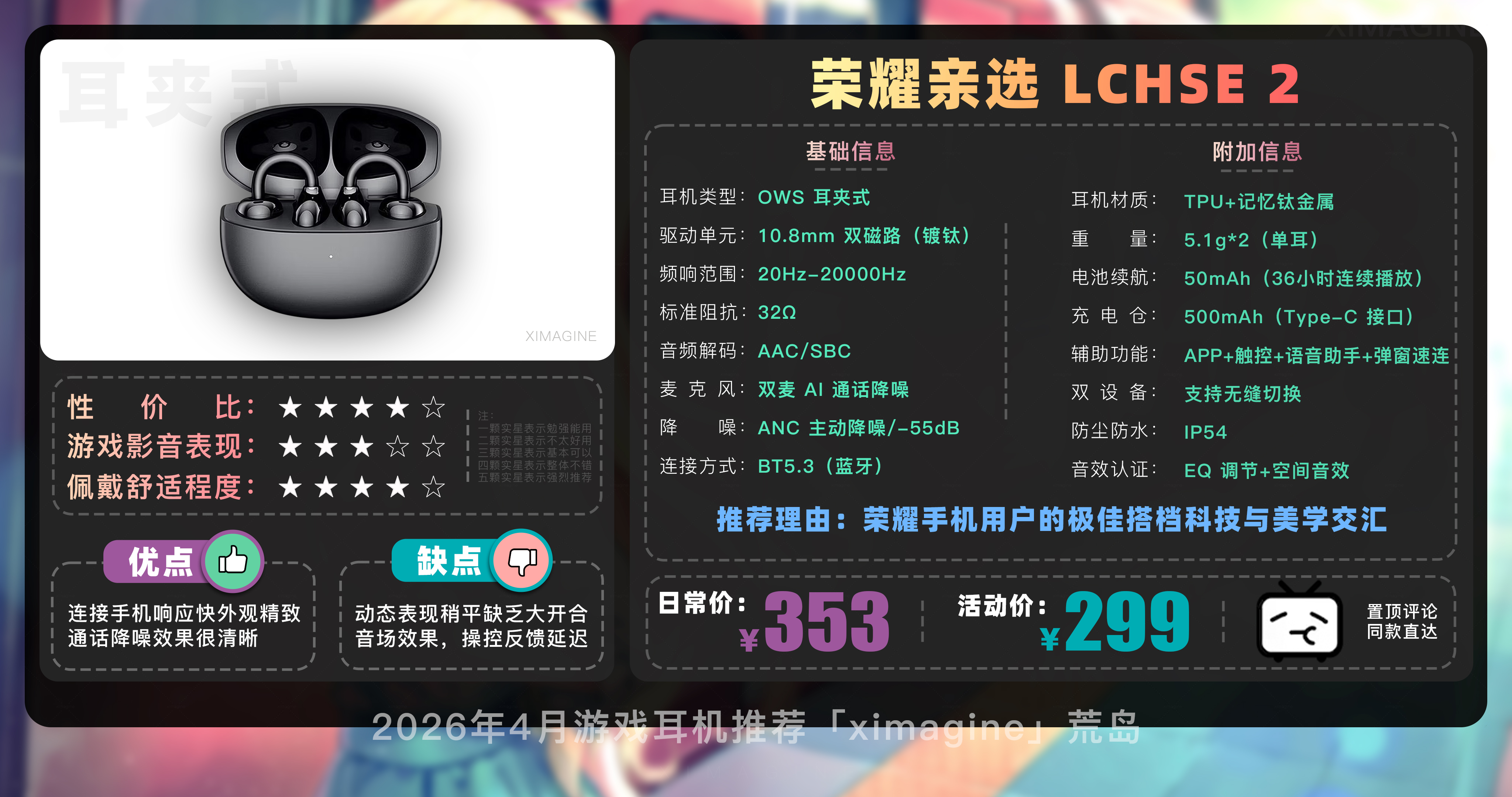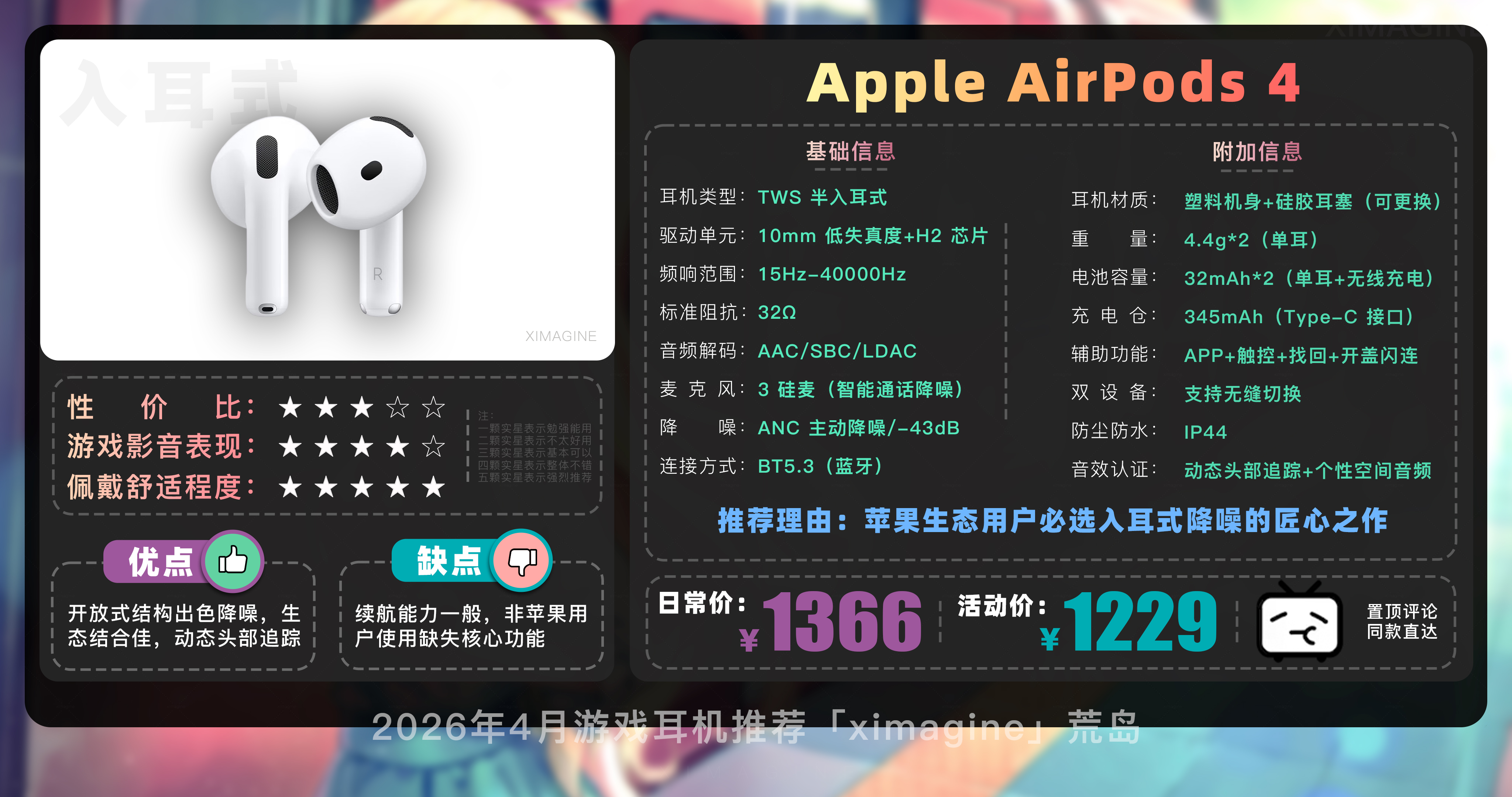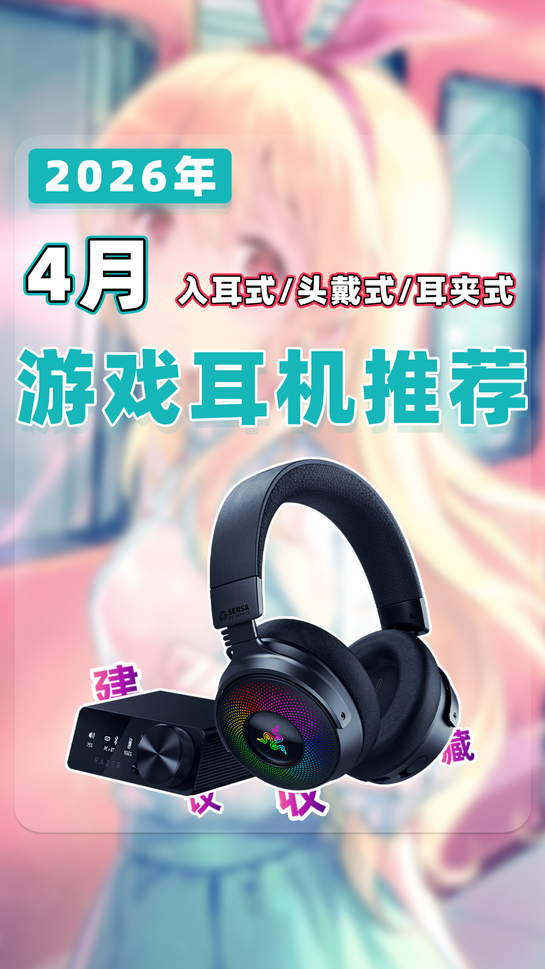 欢迎来到2026年4月游戏耳机推荐合集!我是本期的耳机课代表「ximagine」挑选 24 款性价比高的耳机,其中六款 TWS 入耳式耳机通过物理密封主动降噪,追求动态便携场景自适应;六款头戴式耳机自带物理隔音是声学享受,大尺寸驱动单元带来声场纵深;六款耳夹式耳机利用定向传音技术,像一对挂在耳边的迷你音响;六款电竞耳机追求低延迟特定频率增益,将敌人的碎步声转化为精准坐标;价格由低到高排序,给近期想购买耳机的朋友参考。在选购耳机时需要关注三个支撑核心体验的维度,一驱动编解码协议:驱动单元尺寸材质决定音质上限,入耳式关注振膜刚性头戴式看单元直径,50mm 以上大动圈能提供更多动态余量,LDAC 和 aptX 高阶编解码协议决定音源细节能否完整还原;二工学压力分布:佩戴舒适度决定使用频率,关注单机重量与头梁夹力平衡,头戴式关注分压和记忆海绵,耳夹式看弹性衰减,材质透气性在夏天也很重要;三交互逻辑信号:降噪深度和频宽决定低频过滤质量,双设备连接是多任务办公刚需,App 交互能根据个人耳道微调出最契合的听感闭环。话不多说,正餐开始!