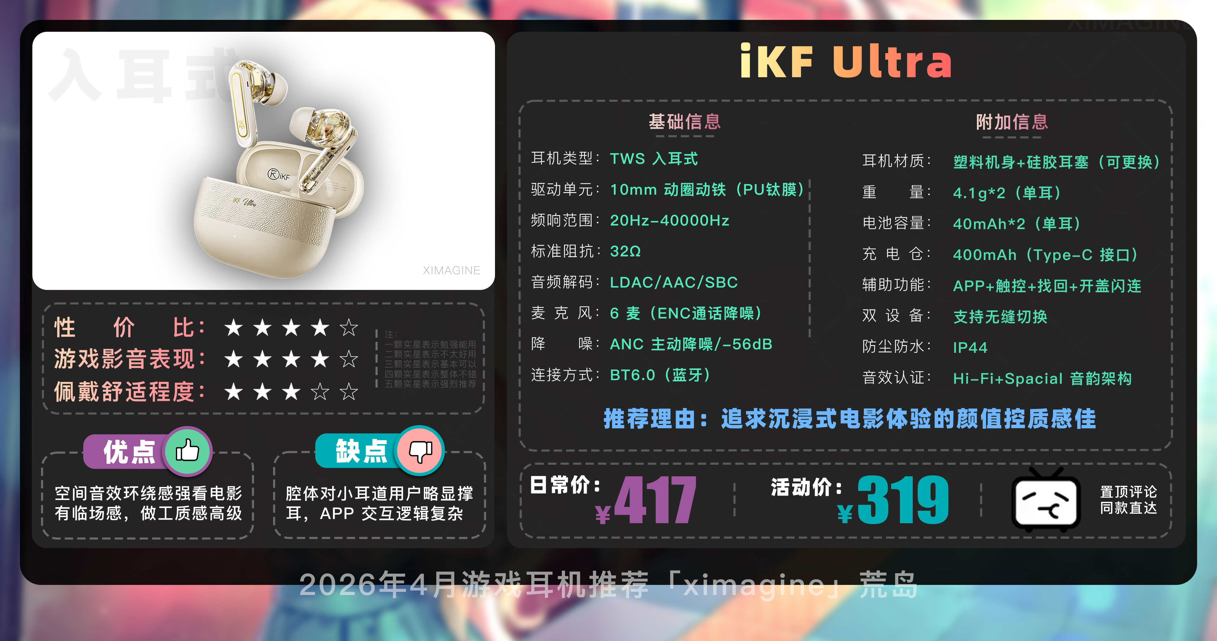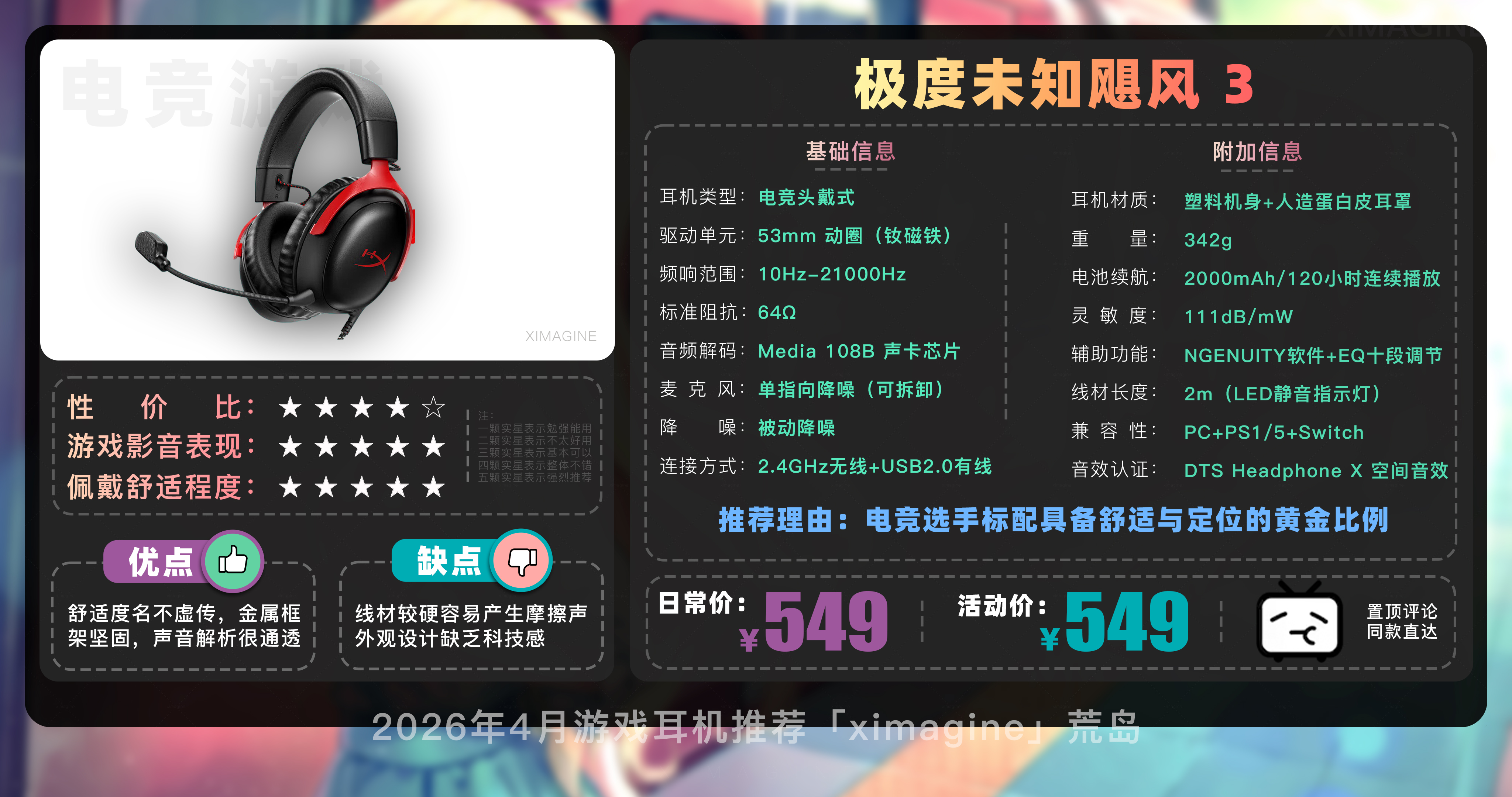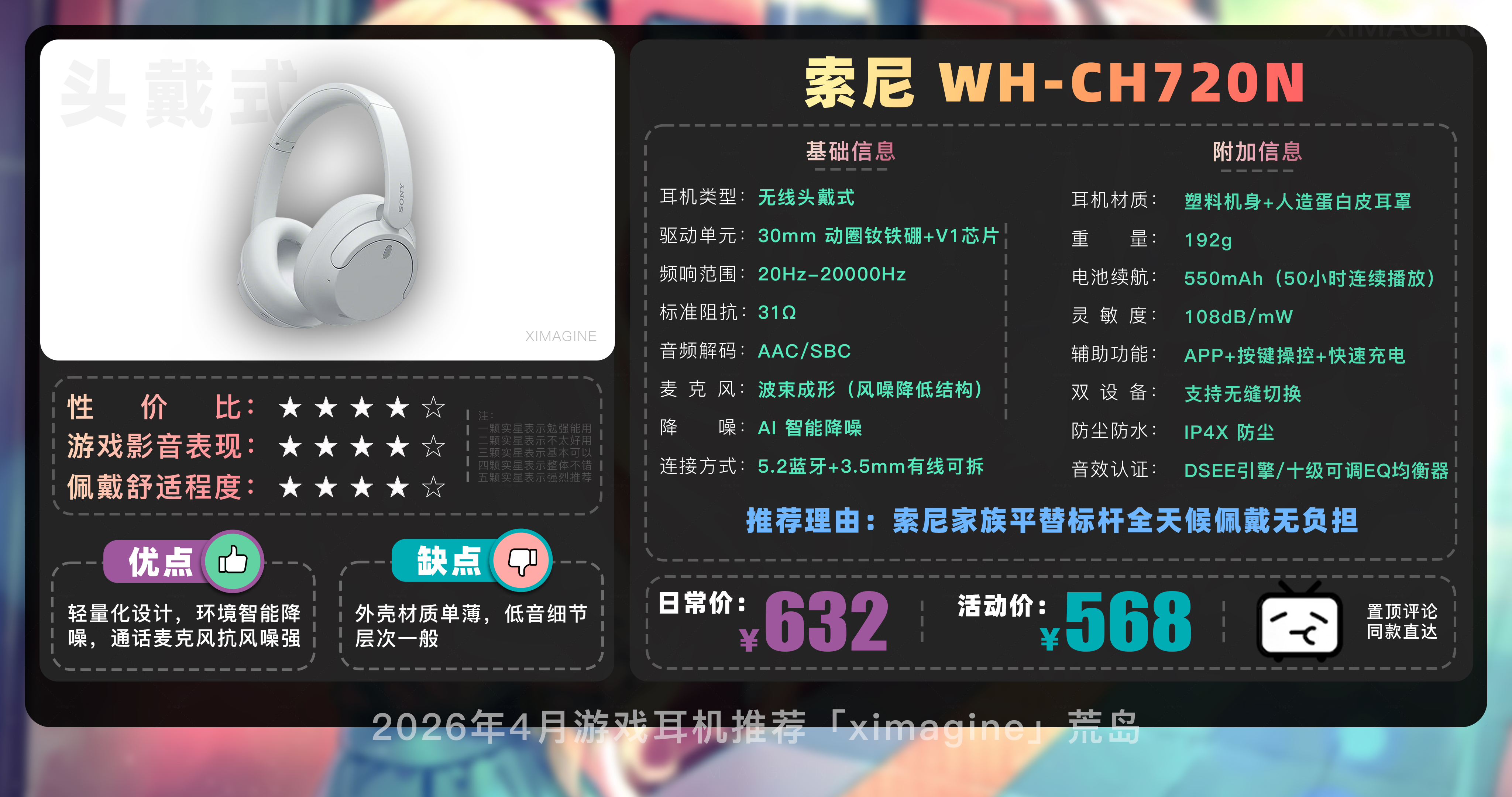 以上就是本期26年月耳机推荐清单,如果有心水的型号,可以戳置顶评论区对应链接拿下!产品会迭代价格会波动,但那种被声音包裹时的松弛沉浸感无可替代,在这个信息过载的时代,耳机早已不再是单纯的数码配件,更像是我们最后一道物理层面的防御。如果觉得内容有所帮助,请关注荒岛,你们的支持是我持续更新的动力!如果对选购游戏耳机还有疑问,欢迎在评论区留言我会尽快回复大家。本期就到这,我是「ximagine」下期再会!