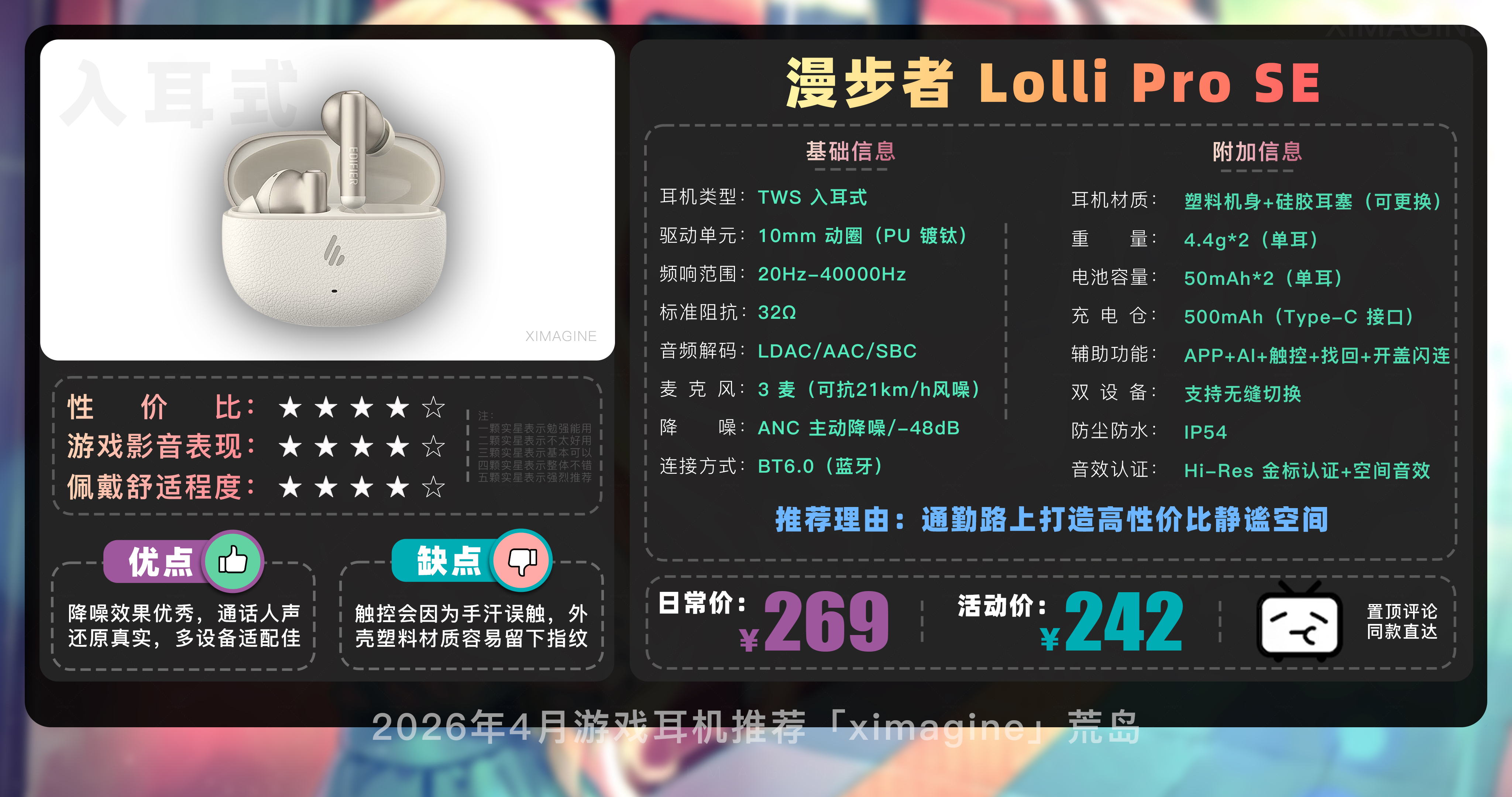 漫步者 Lolli Pro SE 作为常青树,搭载 ANC 混合主动降噪技术,通过内外双反馈麦克风实时拾取环境波形。声学核心是一枚 10mm PU 镀钛复合振膜单元,钛金属的高刚性有效抑制分割振动,使低频下潜更具弹性。其通话时可抗 21km/h 风噪能从嘈杂背景中提取人声,确保通话的信噪比。坐地铁时开启降噪可显著抵消 50Hz-1000Hz 间的机械噪声,低延迟模式则保证在游戏开局时声画同步,242 元的它适合刚需主动降噪,且对品牌售后和连接稳定性有要求的实用主义者。