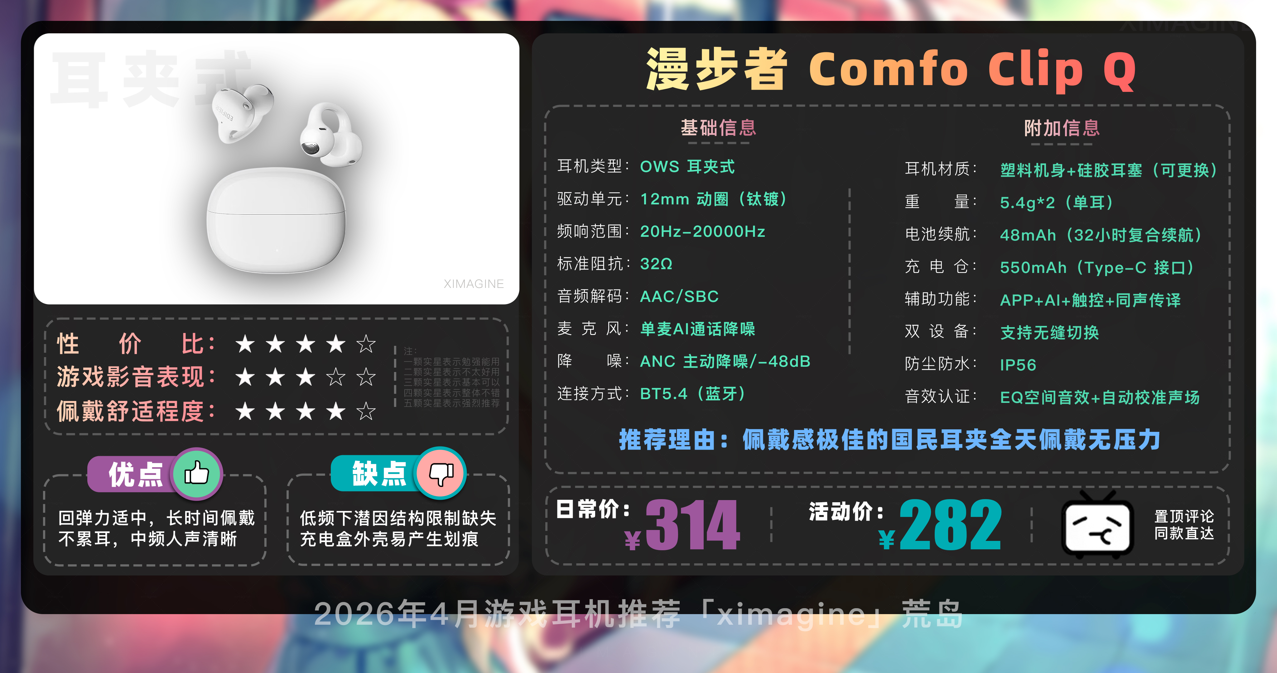 漫步者 Comfo Clip Q 采用记忆镍钛合金丝配合亲肤软胶,抗变形能力强且不夹耳,内部搭载 12mm 钛镀复合振膜单元,低频在开放式结构中依然保有较佳厚度。支持 AI 通话降噪和双设备连接,复合续航可达 32 小时。在工作时像是一对挂在耳边的迷你音响。282 元的它云感佩戴轻盈,长时间挂载不会有痛感,同时方便随时与周围人交流,推荐给追求长时间佩戴舒适度,看重国民品牌质量保障的群体。