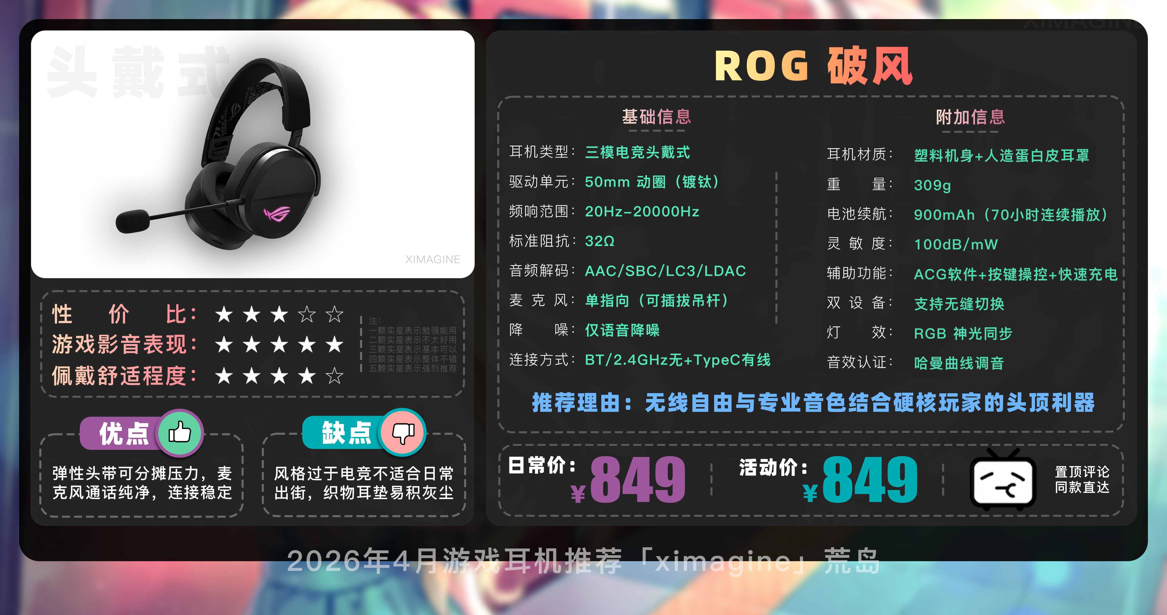 ROG 破风作为一款三模跨界耳机,支持 2.4G SpeedNova 无线技术、蓝牙及 USB-C 有线连接,核心采用 50mm 镀钛振膜驱动单体,三段式弹性头带设计能有效分摊重量。其织物耳垫具有优异的排汗性能,在长时间高强度使用中能保持干爽。849 元的它是一款从电竞游戏到户外运动的全能耳机,在电脑上享受低延迟电竞后,切换到蓝牙模式即可连接手机出街,极高灵活性能胜任多种生活场景,推荐给希望一款耳机解决游戏与日常需求,在意透气性和头顶压力分布的玩家。