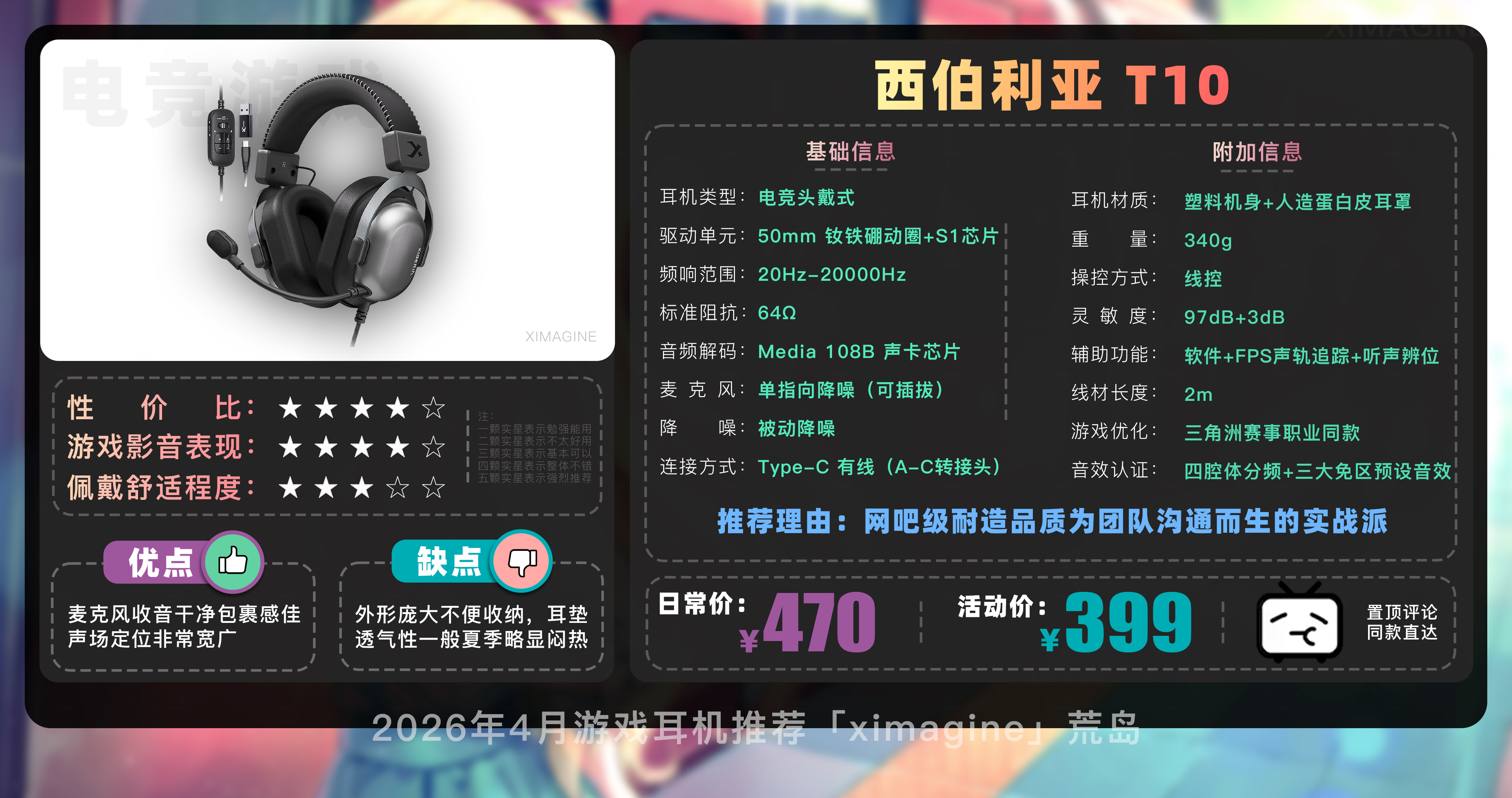 西伯利亚 T10 是典型实战派,配备大尺寸全包裹透气耳罩,声学上采用四腔体分频,支持虚拟 7.1 环绕声,三大免区预设音效声场定位宽广。单指向消噪麦克风带有加粗线材,能有效过滤周围人声,确保团队语音指挥的纯净。在环境吵闹的网吧,399 的元它大耳罩提供优秀物理静谧感,对 3A 大作的爆炸声还原极具冲击力,低音调校非常适合动作电影,追求高可靠性,大声场和重低音效果的实战型玩家可以冲。