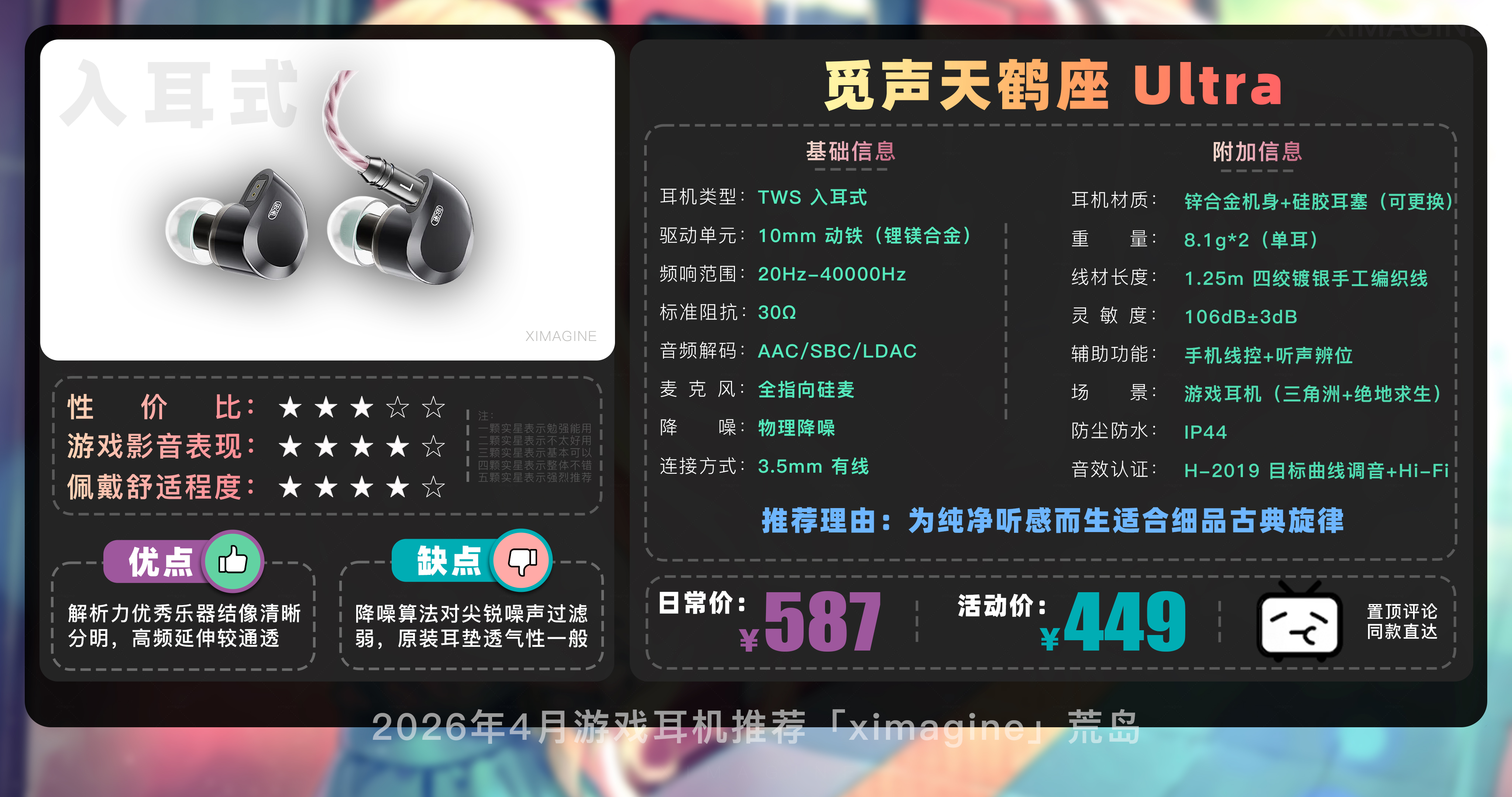觅声天鹤座 Ultra 针对听感派设计的产品,内部搭载 10mm 锂镁合金动铁,并支持 LDAC 解码高品质音频,频响曲线在中高频部分有做微调增益,提升弦乐和女声的通透度,耳塞套采用高回弹亲肤材质,形成良好的物理声学密封性,增强低频量感。449 元它由于极高解析力,播放无损音乐时,能捕捉到歌手微弱的换气声和配器声,不会糊成一片,推荐给对音质有追求喜欢收听古典或流行女声,且手机支持 LDAC 传输协议的无损音乐爱好者。