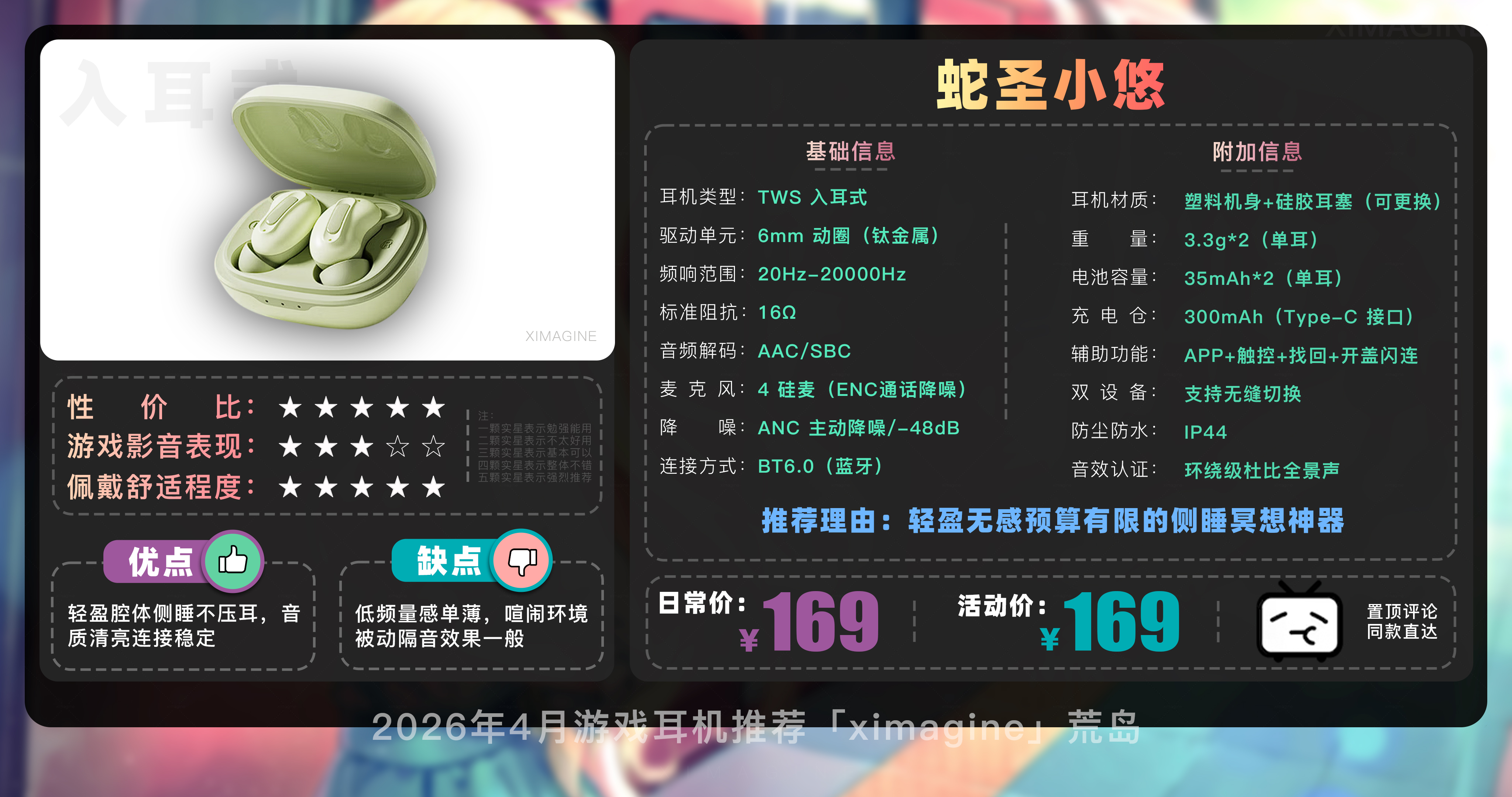 蛇圣小悠在物理结构上采用超薄扁平化腔体,通过将内部元器件进行异形堆叠,使整体厚度大幅压缩,直接解决传统耳机侧睡时顶住耳屏的压迫痛点,使耳廓受力更加均匀,声学层面集成 6mm 钛金属动圈,相比同价位瞬态响应更快,在中高频解析力上表现干脆利落。深夜侧卧刷视频或收听白噪音时,单耳 3.3g 的重量配合硅胶微弧曲率耳塞,能稳固嵌在耳甲腔内翻身也不易脱落,169 元的它适合耳道敏感有侧睡听音习惯,追求无感佩戴的用户。