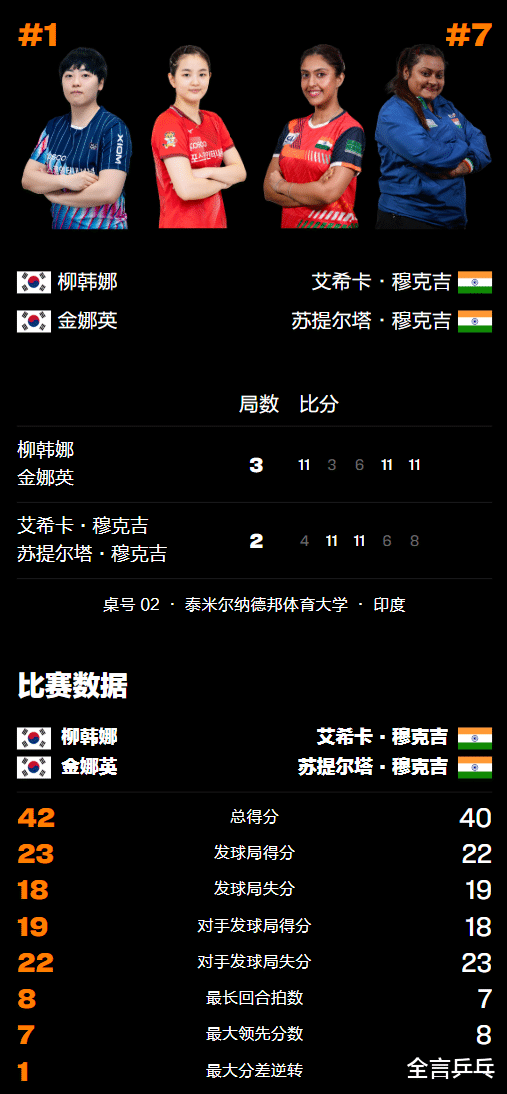 比赛开始后,韩国组合在开局阶段还是不太适应对方的打法——A·穆克吉是极其罕见的正手生胶、反手防弧选手,S·穆克吉则是正手正胶、反手反胶,球路比较怪异,但很快金娜英/柳韩娜便找到感觉将比赛打简单化,通过两面反胶的旋转优势制胜,随即以11-4轻松拔得头筹。
