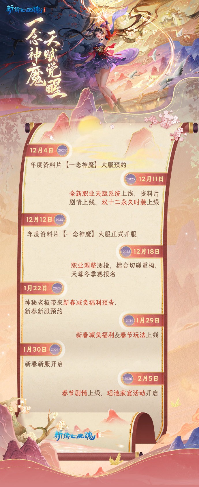 年度资料片新服预约通道现已火爆开启!12月5日-11日为期 7 天的预约签到已开启,12 月 12 日 19:00 正式开服共赴新征程!现在预约即可解锁专属礼包,灵伴小天天萌趣加盟、砚台台坐骑酷炫登场,助力少侠开局即巅峰~更有天尊真武坛巅峰对决燃情来袭,谁能神睨天下,踏破凌霄?即刻预约新服,解锁更多版本惊喜吧!