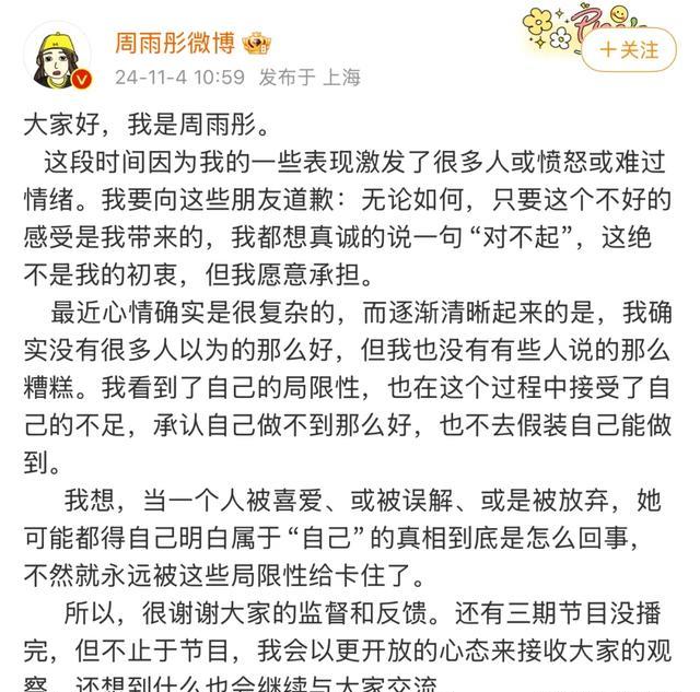 最近几天,在《花少6》里频频引人争议的周雨彤,终于忍不住发了篇长文来向大家道歉。