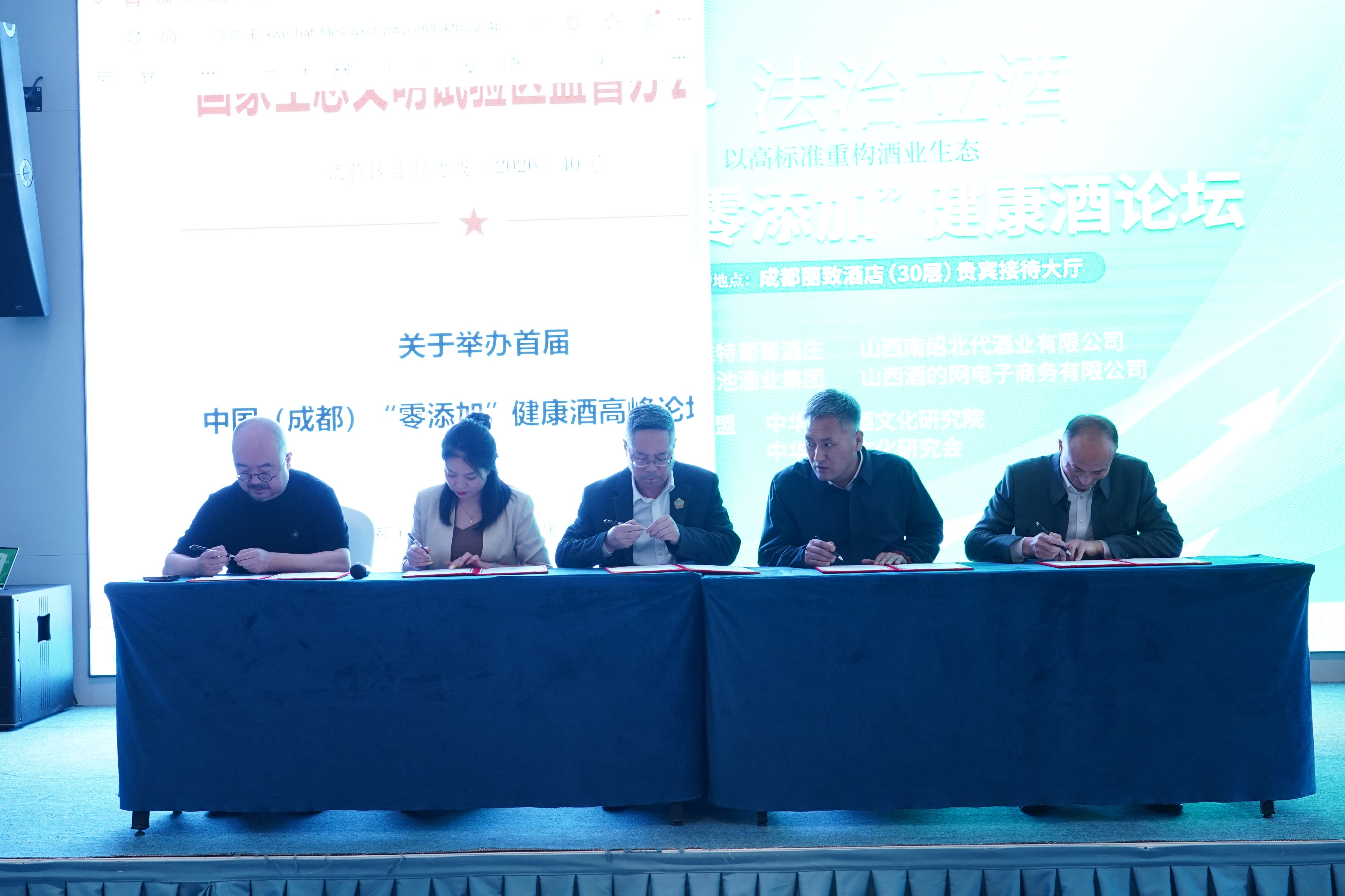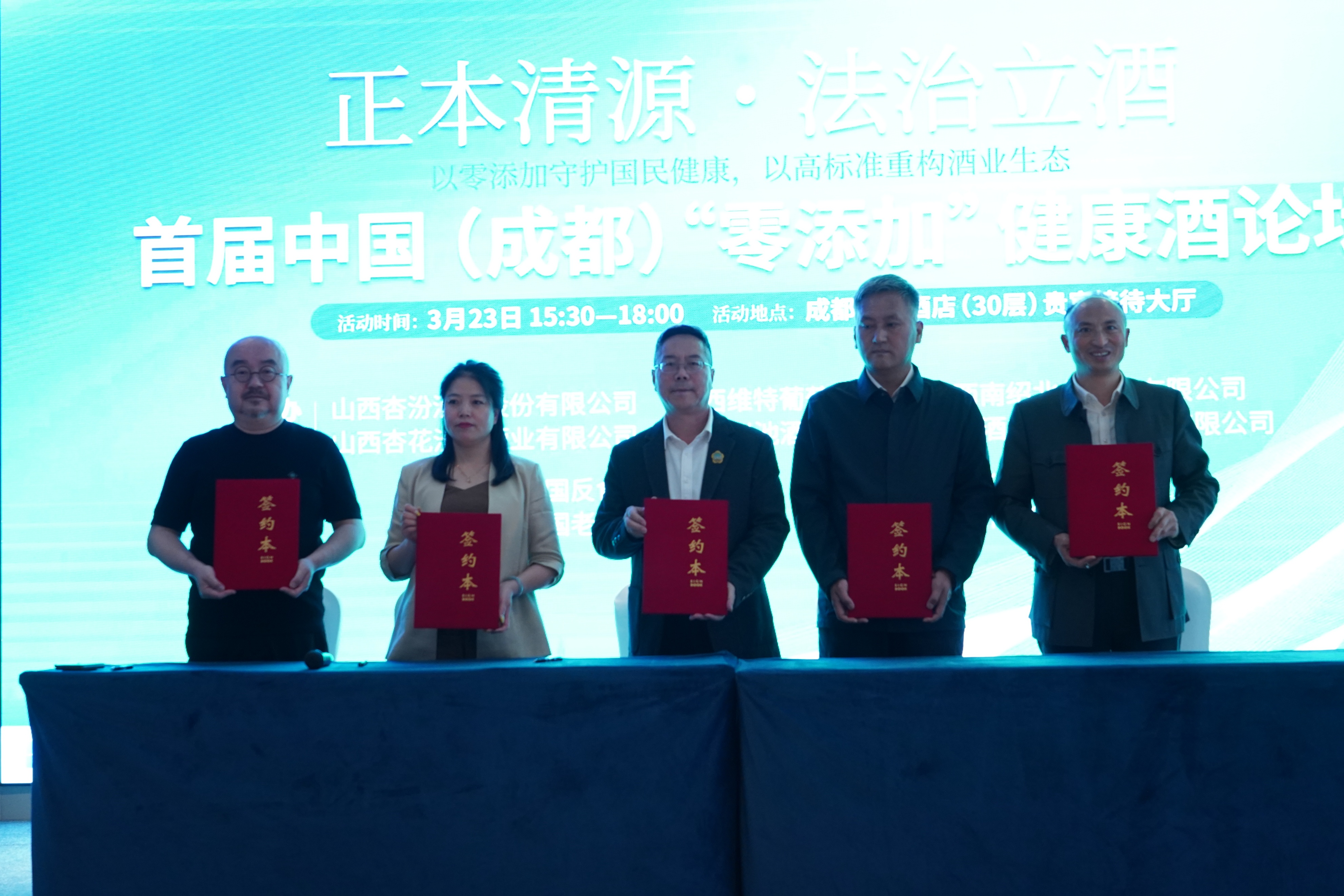 论坛现场举行隆重签约仪式,山西杏汾酒业、川池集团.华沃酿酒研究院、山西杏花汾河酒业、山西维特葡萄酒庄、山西南绍北代酒业五家企业共同签署零添加健康酒战略联盟协议,正式结成产业联盟,携手推进中国零添加健康酒事业发展,以企业自律汇聚守护国民饮酒健康的磅礴力量。