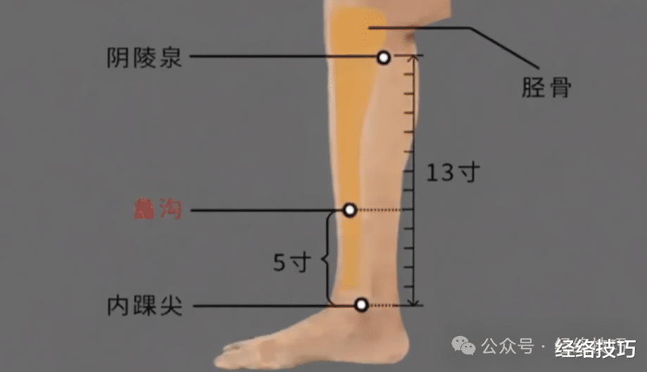 先找到脚内侧那个凸出的骨头尖,也就是内踝尖,内踝尖上5寸(四指宽加两横指),在内侧胫骨面的中间位置按一按,能找到一个酸胀感比较显著的点,那就是蠡沟穴了。